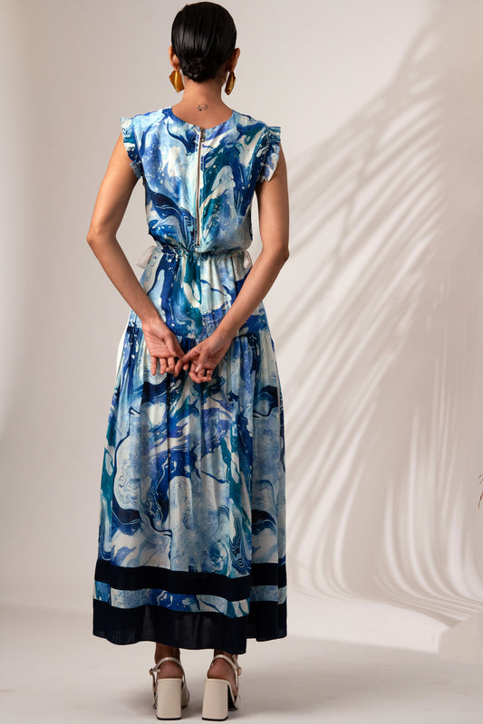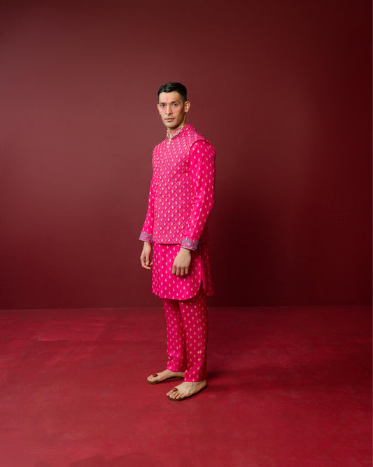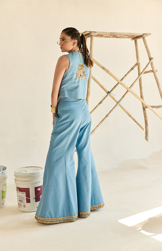 DENIM WAIST COAT AND SILK JECQUARD CRUSHED LEHANGA