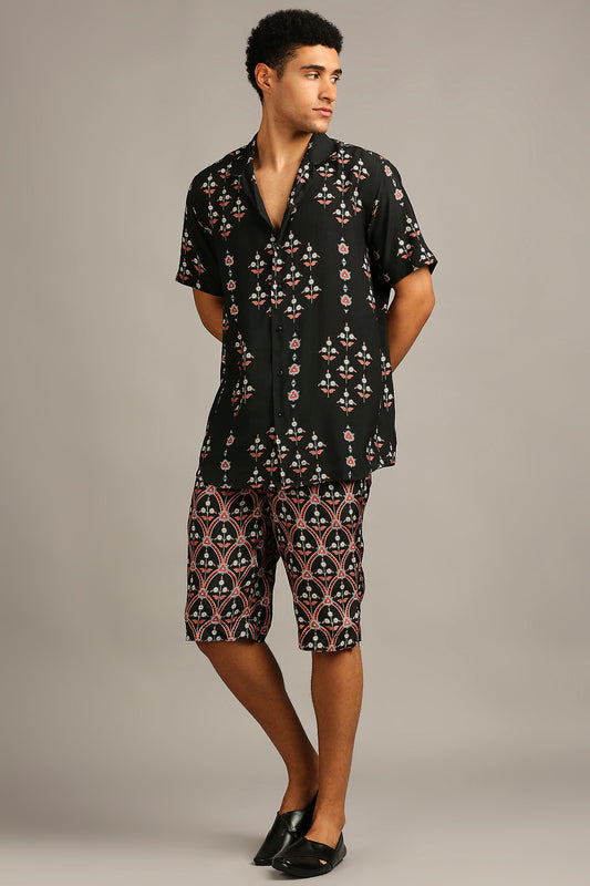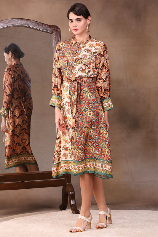 ETHNIC FOLKLORE PRINTED SHIRT DRESS WITH WAIST TIE-UP