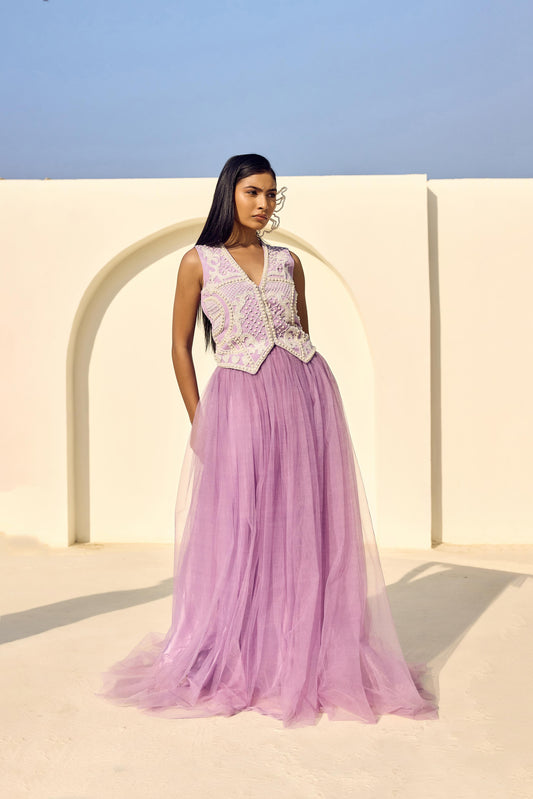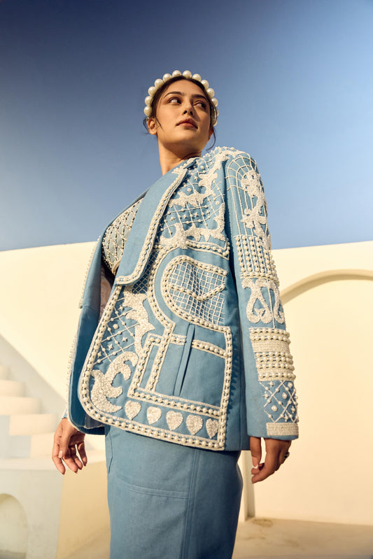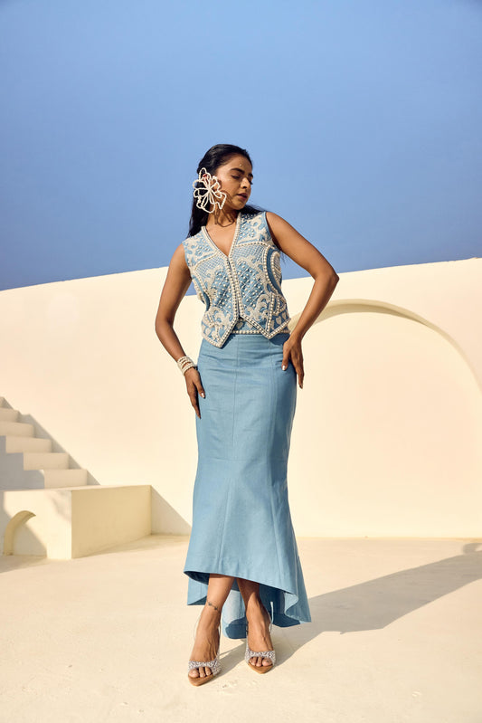 PEARL DENIM WAIST COAT WITH DENIM HIGH LOW SKIRT