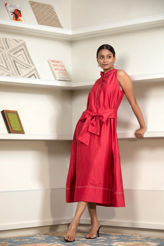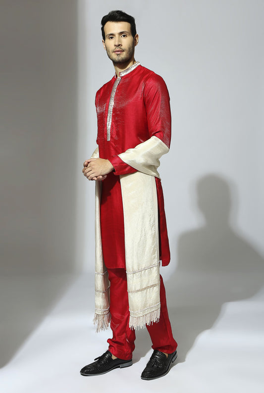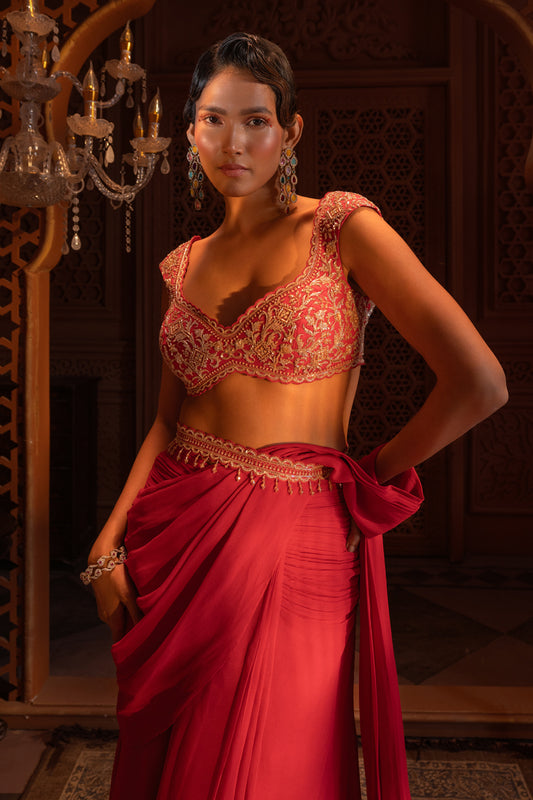 RED BLAZER WITH BEIGE SAREE WITH EMBROIDERD BELT