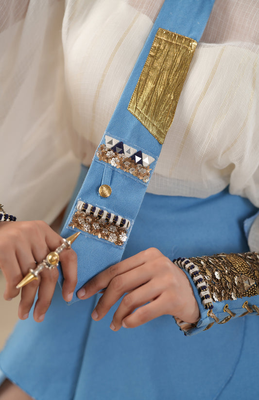 DENIM SHORT JUMPSUIT WITH SHEER KOTA DORIA SKIRT