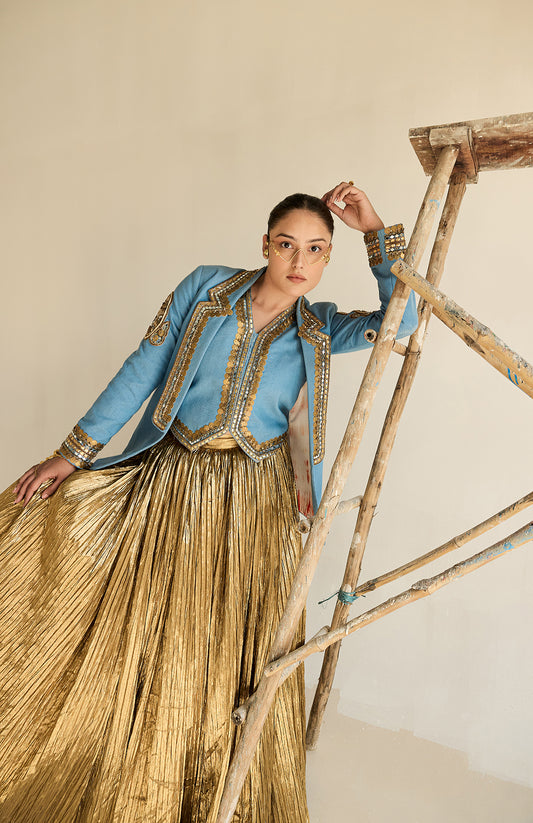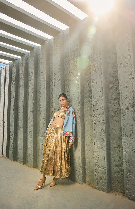 DENIM CROP JACKET WITH DENIM CORSET AND GOLD SKIRT