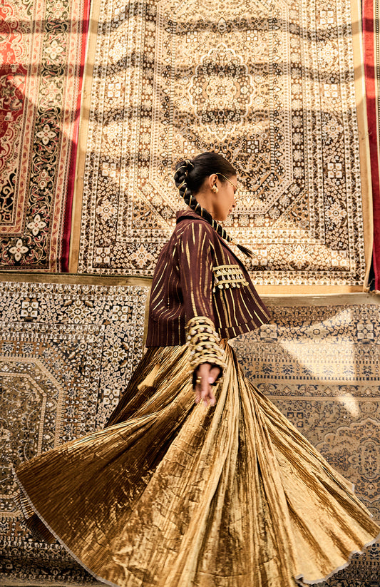 VELVET BLAZER SILK JACQUARD WAIST COAT CRUSHED LEHANGA