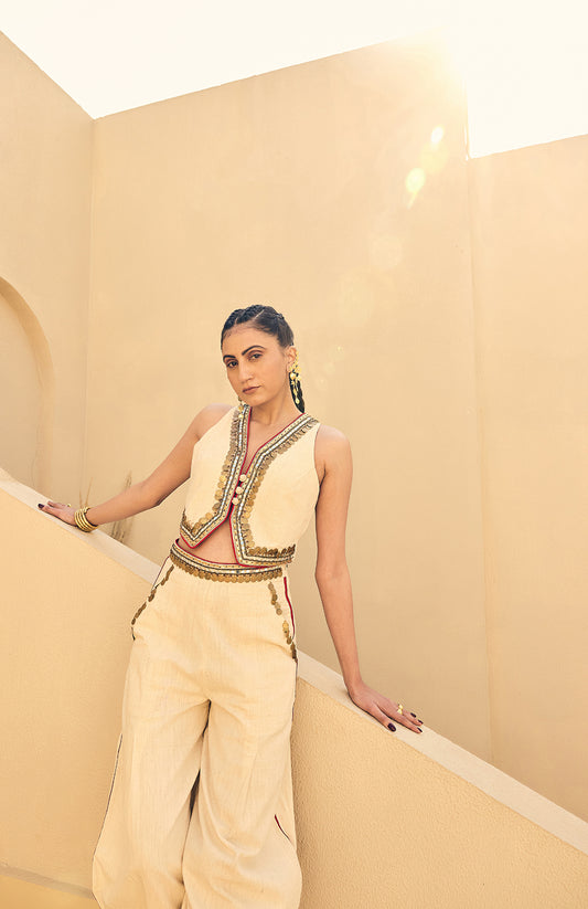 DENIM WAIST COAT AND SILK JECQUARD CRUSHED LEHANGA