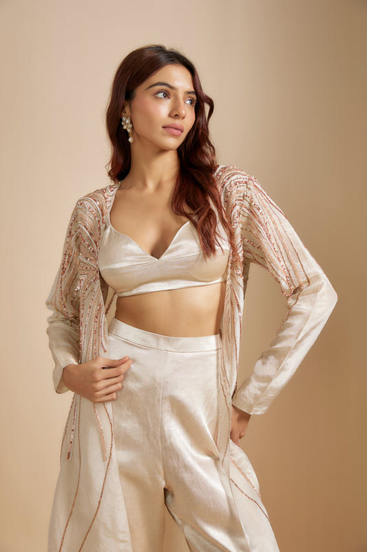 BEIGE EMBROIDERD JACKET WITH BEIGE TOP AND PANT
