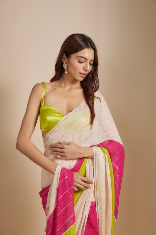 MULTI-COLOUR BLOCK SAREE WITH NEON GREEN BLOUSE