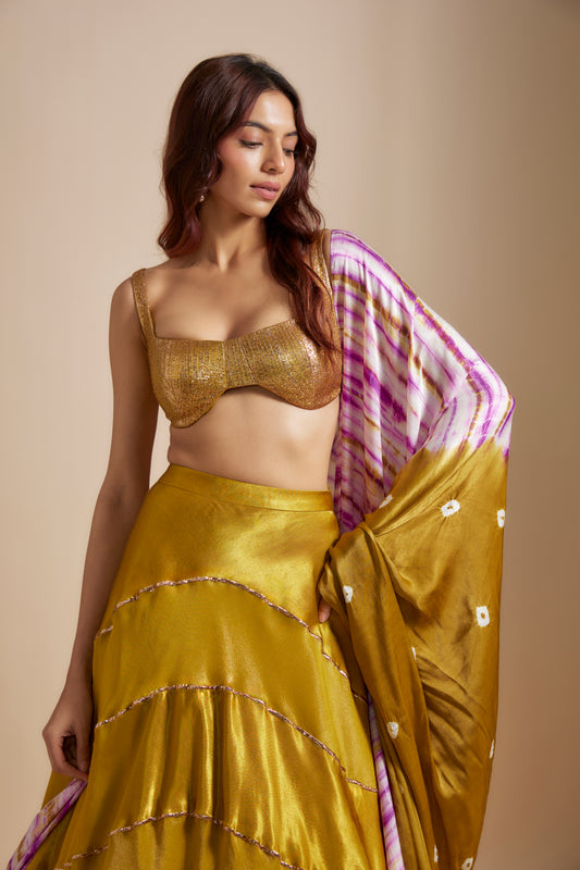 MUSTARD BLOCK SKIRT WITH BADLA EMBROIDERED BLOUSE WITH SHIBORI DUPATTA