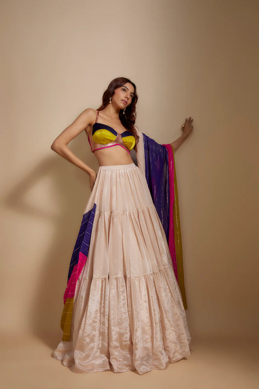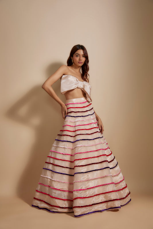 PEACH MULTIPLE-COLOURED EMBROIDERED LEHENGA WITH BOW BLOUSE