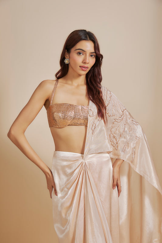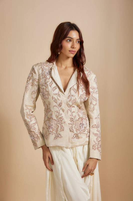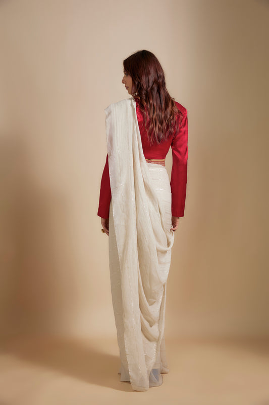 RED BLAZER WITH BEIGE SAREE WITH EMBROIDERD BELT