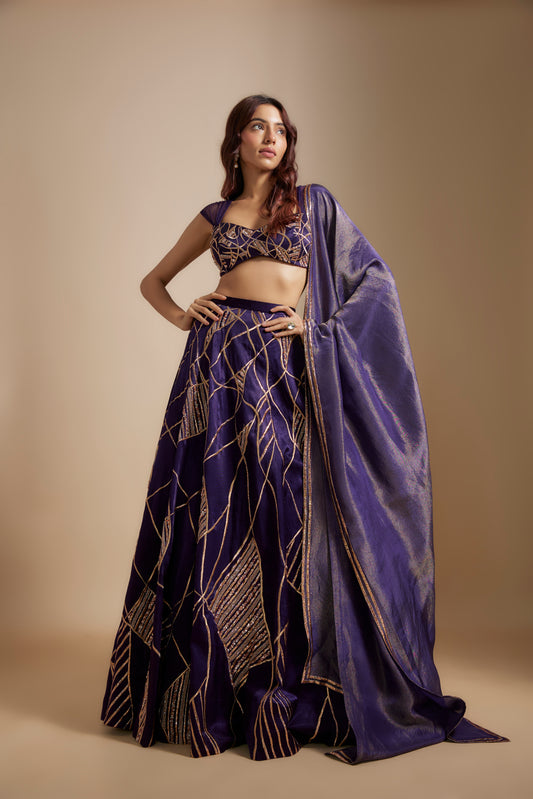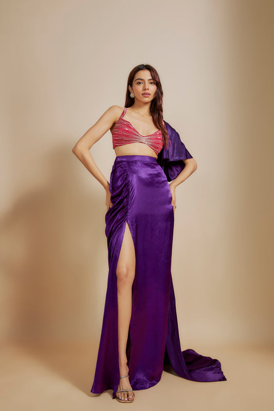 RED EMBOIDERD BLOUE WITH PURPLE SKIRT & DRAPE