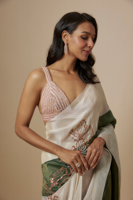 GREEN AND BEIGE COLOUR BLOCK SAREE WITH EMBROIDERED BLOUSE