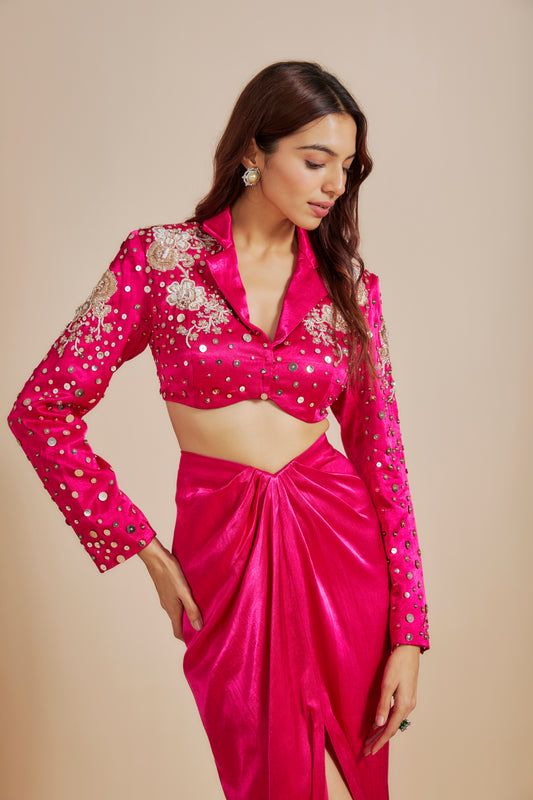 HOT PINK EMBORIDERD BLAZER WITH HOT PINK DAPE SKIRT
