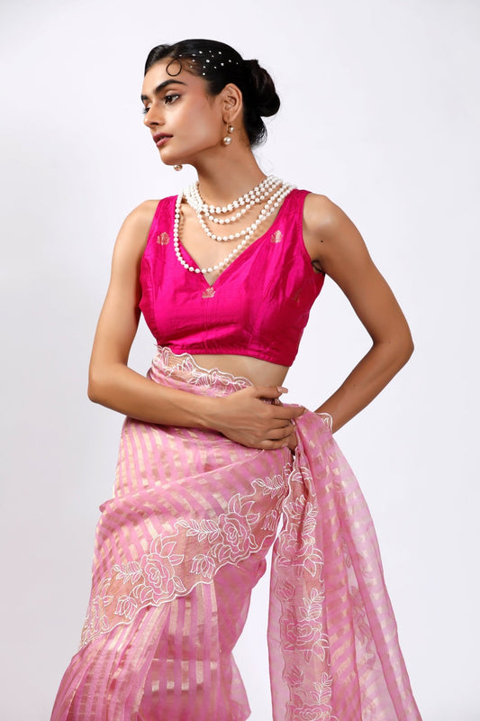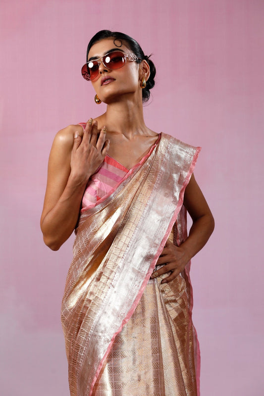 HANDWOVEN PINK TISSUE BROCADE CHECKERED SAREE