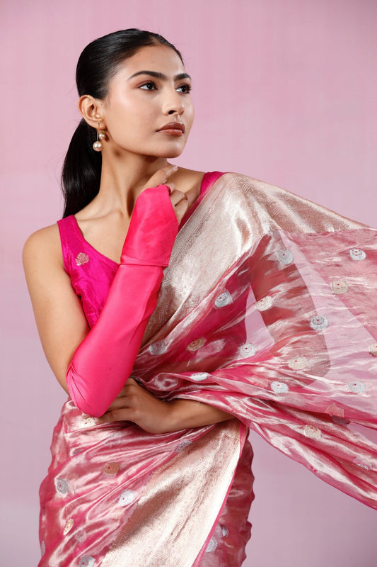 HANDWOVEN CHANDERI TISSUE PURPLE GREEN PINK SAREE