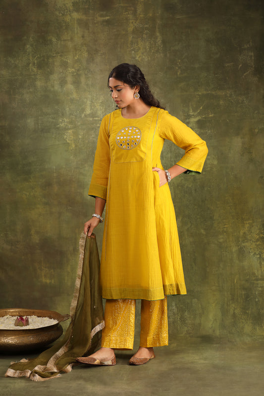 MUSTARD PITTA HAND EMBROIDERED CHANDERI SUIT SET