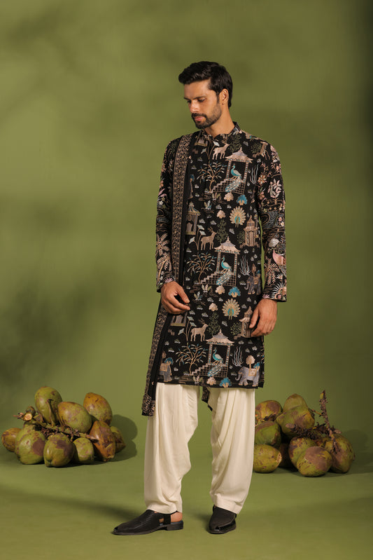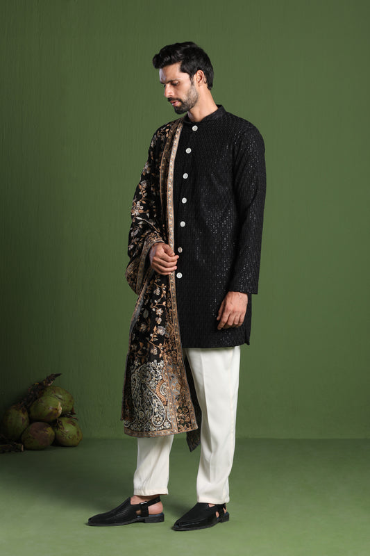 RAJAS BLACK FRONT OPEN KURTA SET WITH HEAVY EMBROIDERED DUPATTA