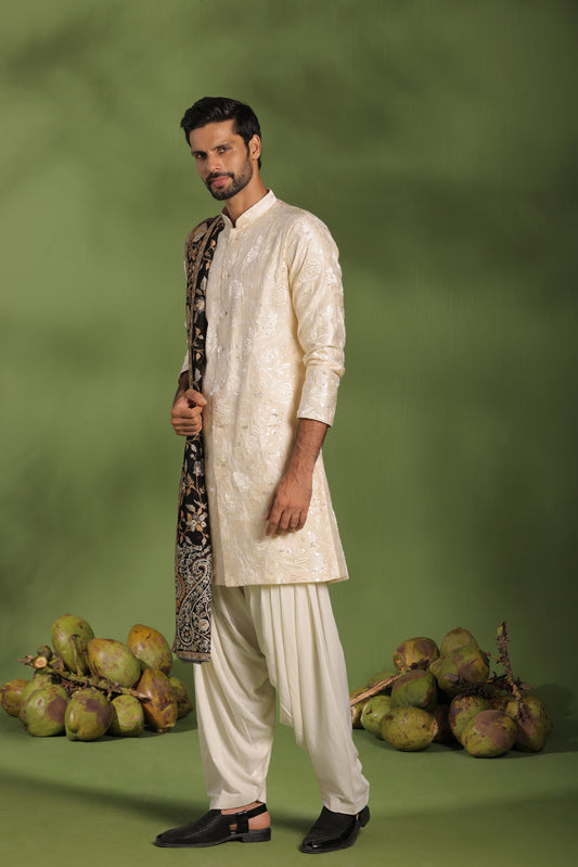 KAUSTUBH CREAM FRONT OPEN KURTA PATIYALA SET WITH DUPATTA