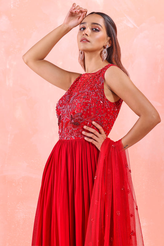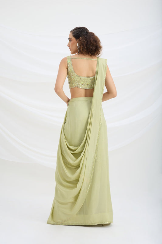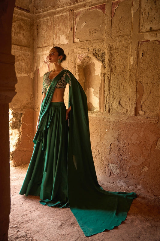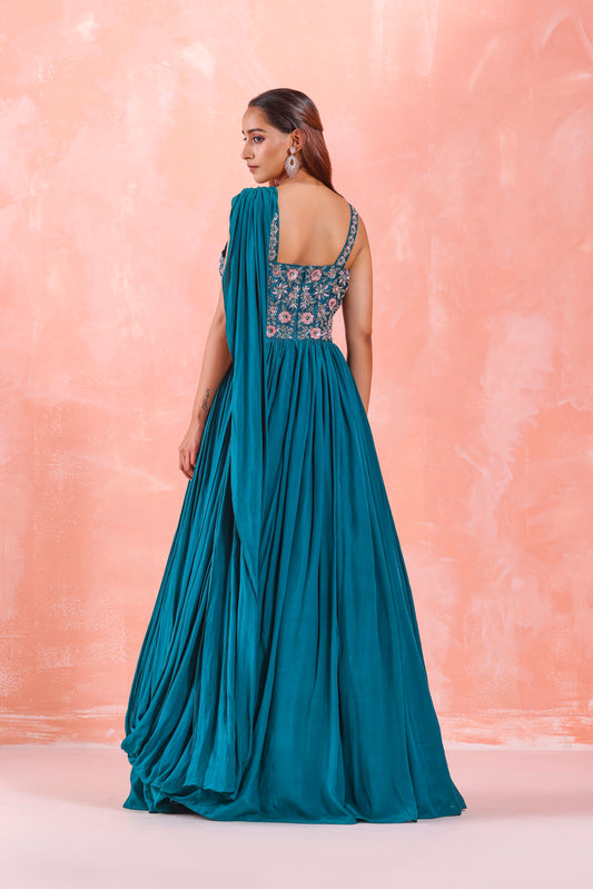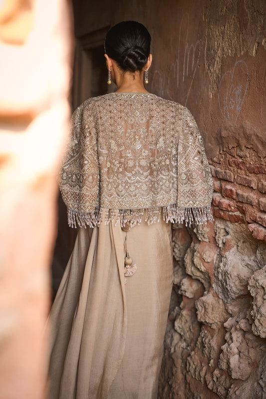 PRE DAPE SAREE WITH EMBROIDERED CAPE AND CORSET