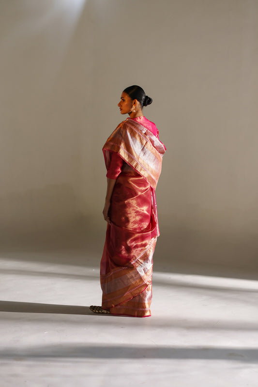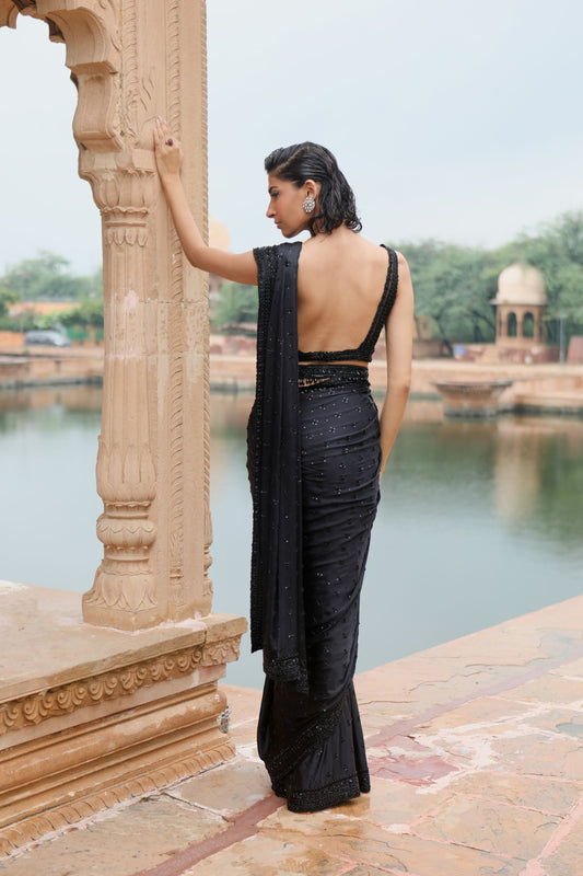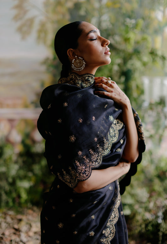 BLACK AND SAPPHIRE BLUE MULTI HUED AJRAKH SAREE WITH ZARI PALLU