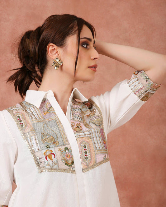 THREAD WORK WITH SWAROVSKI BUTTON ON LINEN