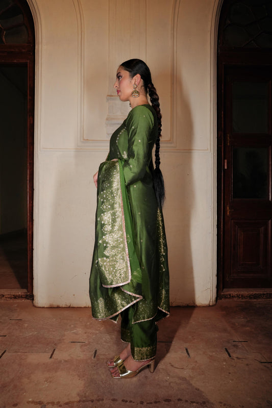 CHAMPAGNE CRYSTAL ANARKALI & WIDE LEG PANT WITH CRYSTAL NET DUPATTA