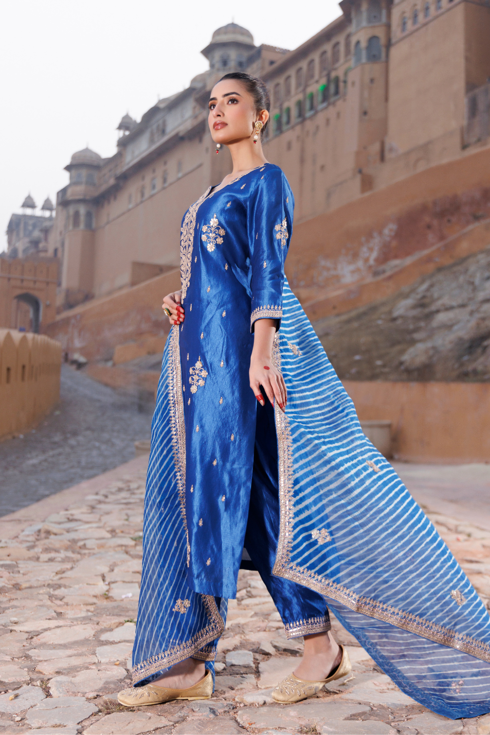 A Regal Blue Hand Embroidered Suit With Motifs So Distinct That Makes It A Timeless Yet Contemporary Design, Making The Woman Who Adorns Aarna Suit The Center Of Attention Everywhere She Goes. Elevated With Ancient Crafts Of Dori Marodi, Gotta Patti, Sequins & Reshamwork, Aarna Is The Perfect Addition To Your Ocassionwear Wardrobe.