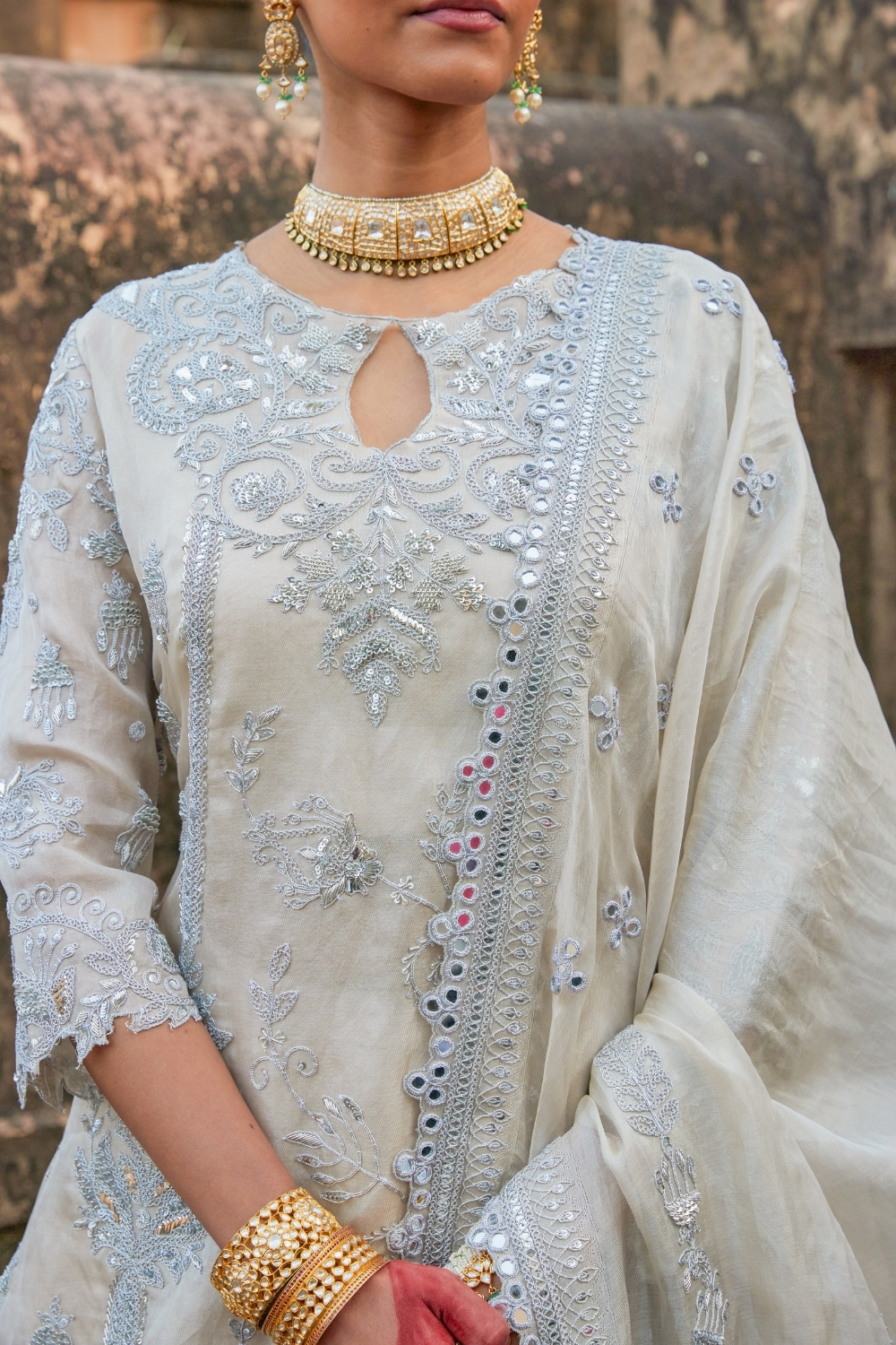 Quietly Luxurious, The Subtle Ornamentation On This Fusion Lehenga Set Is Enhanced With Tone-On-Tone Silver  Embroidery All Presented In A Contemporary Silhouette. Crafted On Pure Tissue, Aarna Tissue Fusion Set Is Elevated With Handcrafted Dori Marodi, Mukaish, Sequins And Mirror Work. Perfect For All Your Festive Soirees And Glamarous Night Time Events.