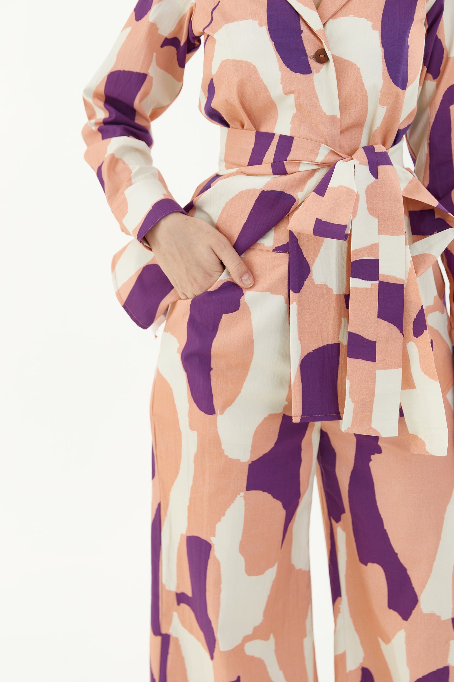 Purple, White And Orange Wide Leg Pants Based On Poplin Cotton Features Abstract Print. It Is Paired With A Printed Belt.