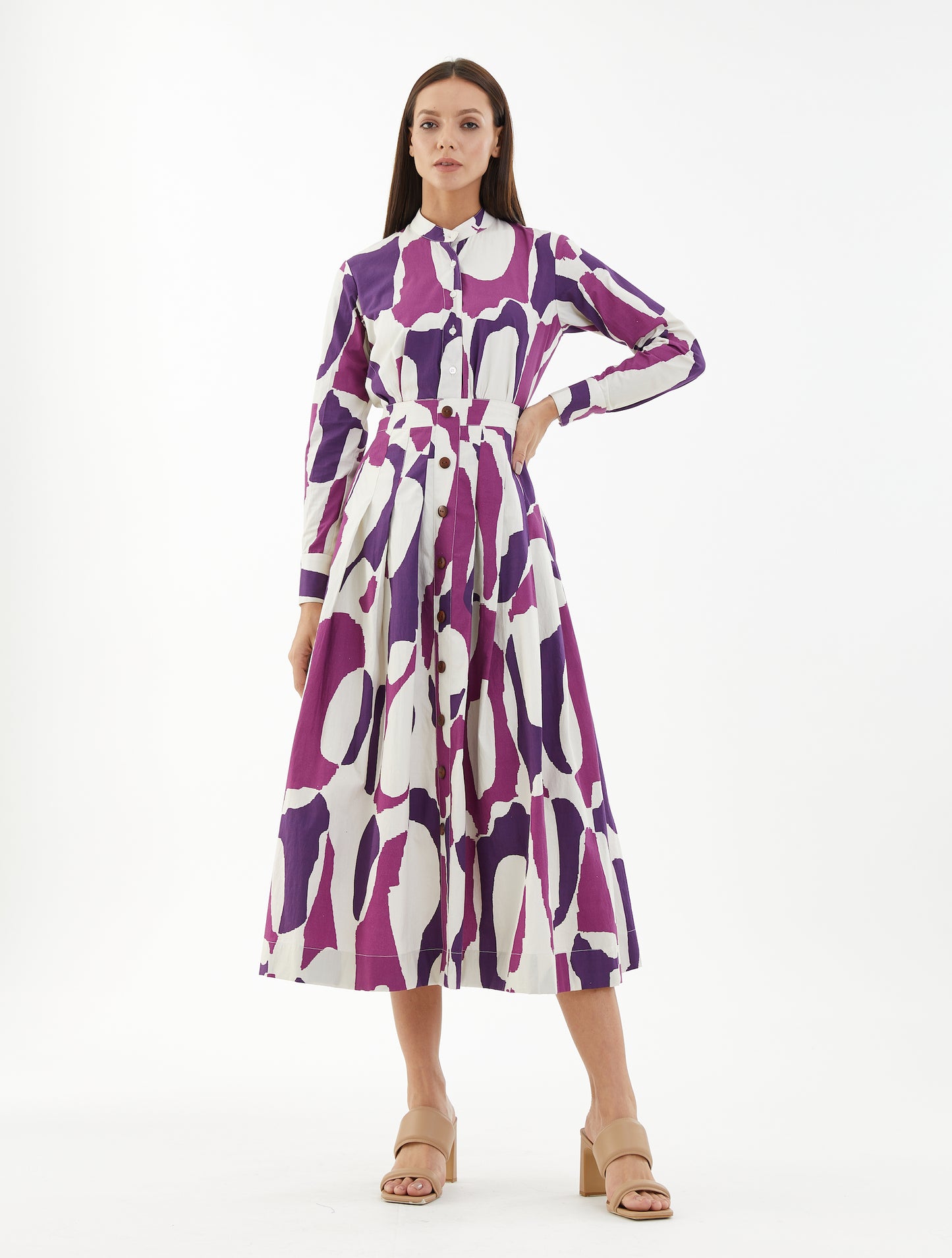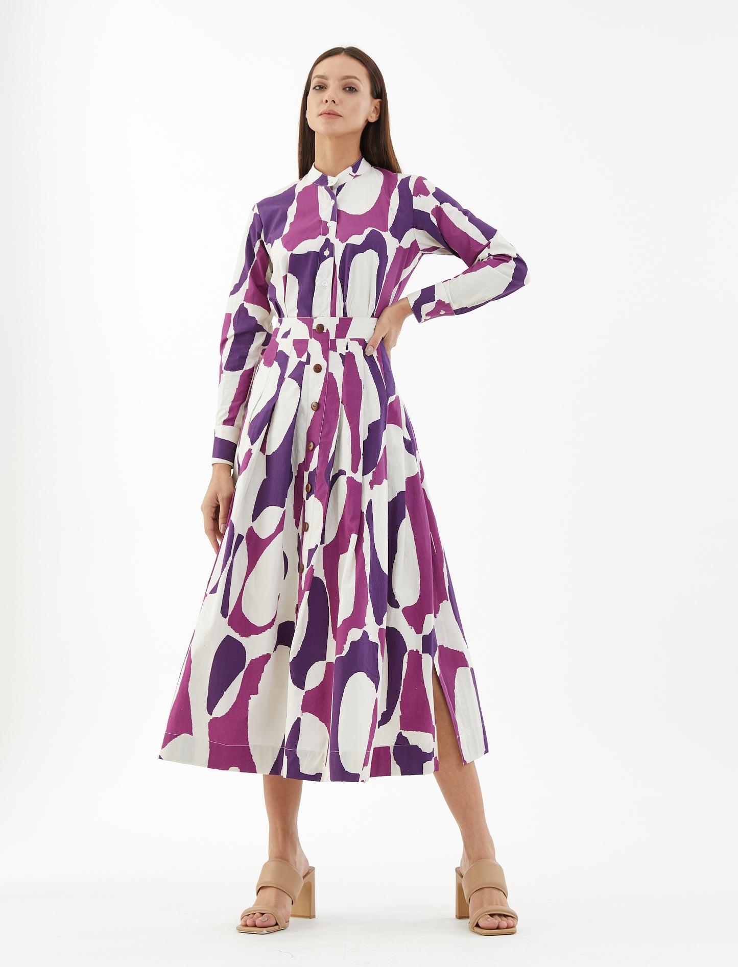 Purple, Pink And White Shirt Based On Poplin Cotton Features Abstract Print.