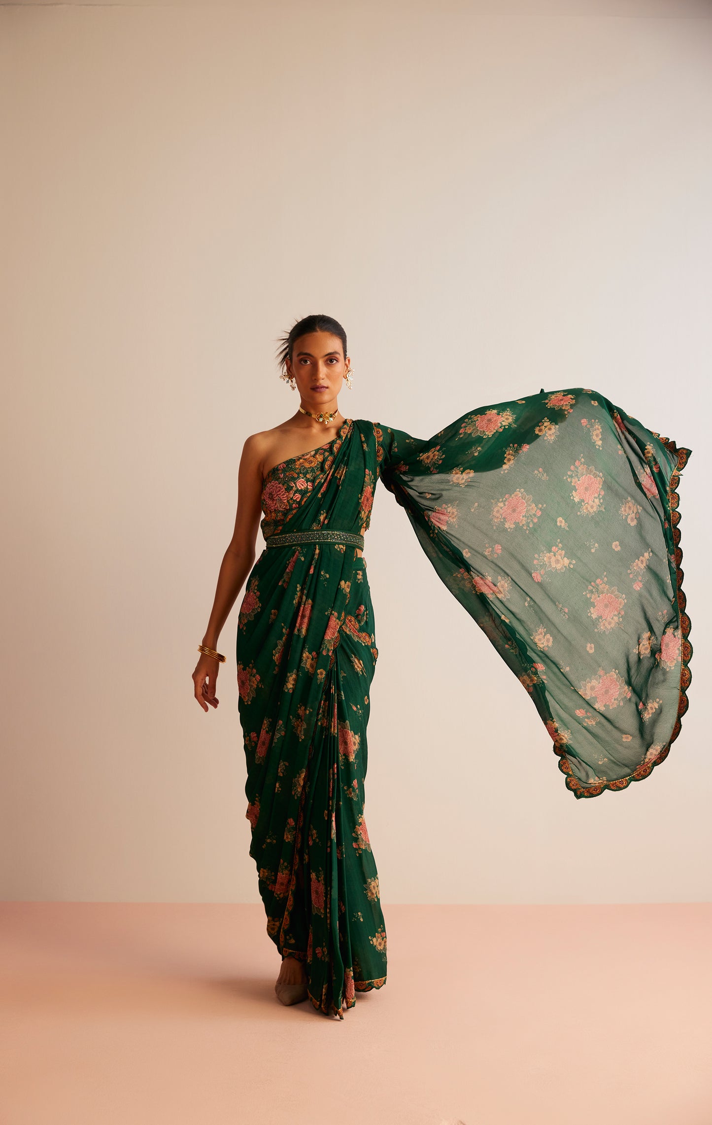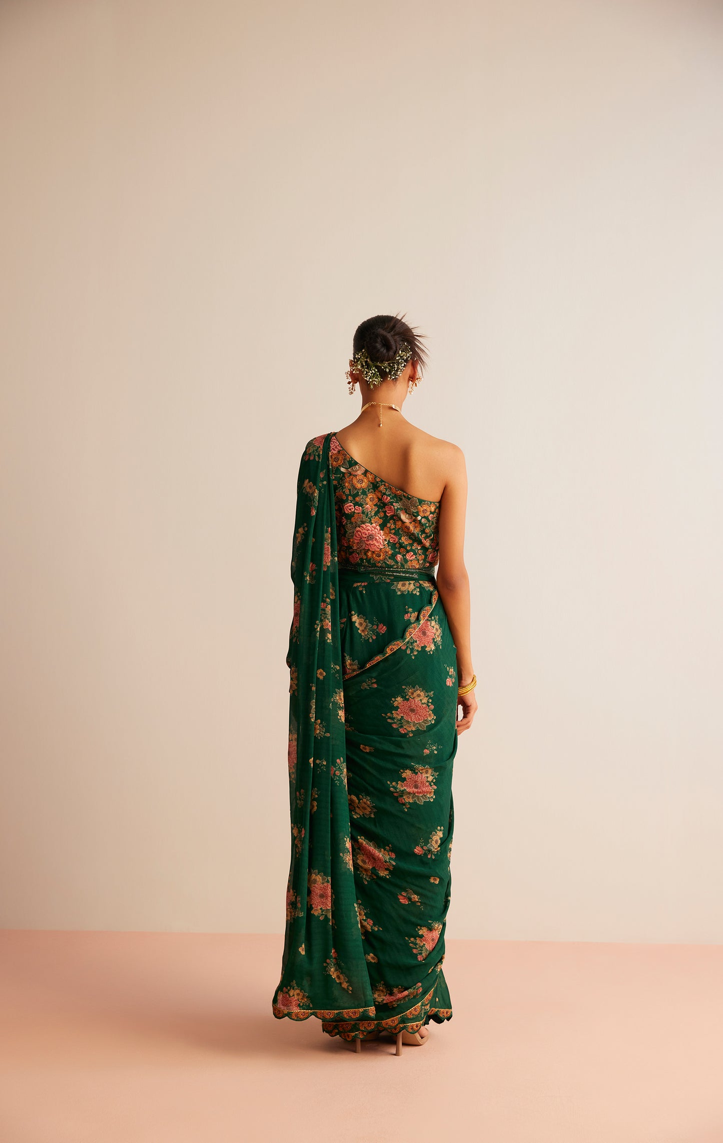 Crafted From The Finest Viscose And Viscose Georgette Fabric, This Ensemble Features A Sumptuous Saree In Rich Bottle Green, Paired With A One-Shoulder Sleeve-Detailed Blouse That'S Both Printed And Handcrafted To Perfection. The One-Shoulder Sleeve-Detailed Blouse Adds A Touch Of Modernity And Allure, Creating A Balanced Contrast Between Traditional And Contemporary Elements. Whether You'Re Attending A Wedding, A Formal Event, Or A Celebratory Occasion, This Ensemble Will Make You The Embodiment Of Timeless Beauty.