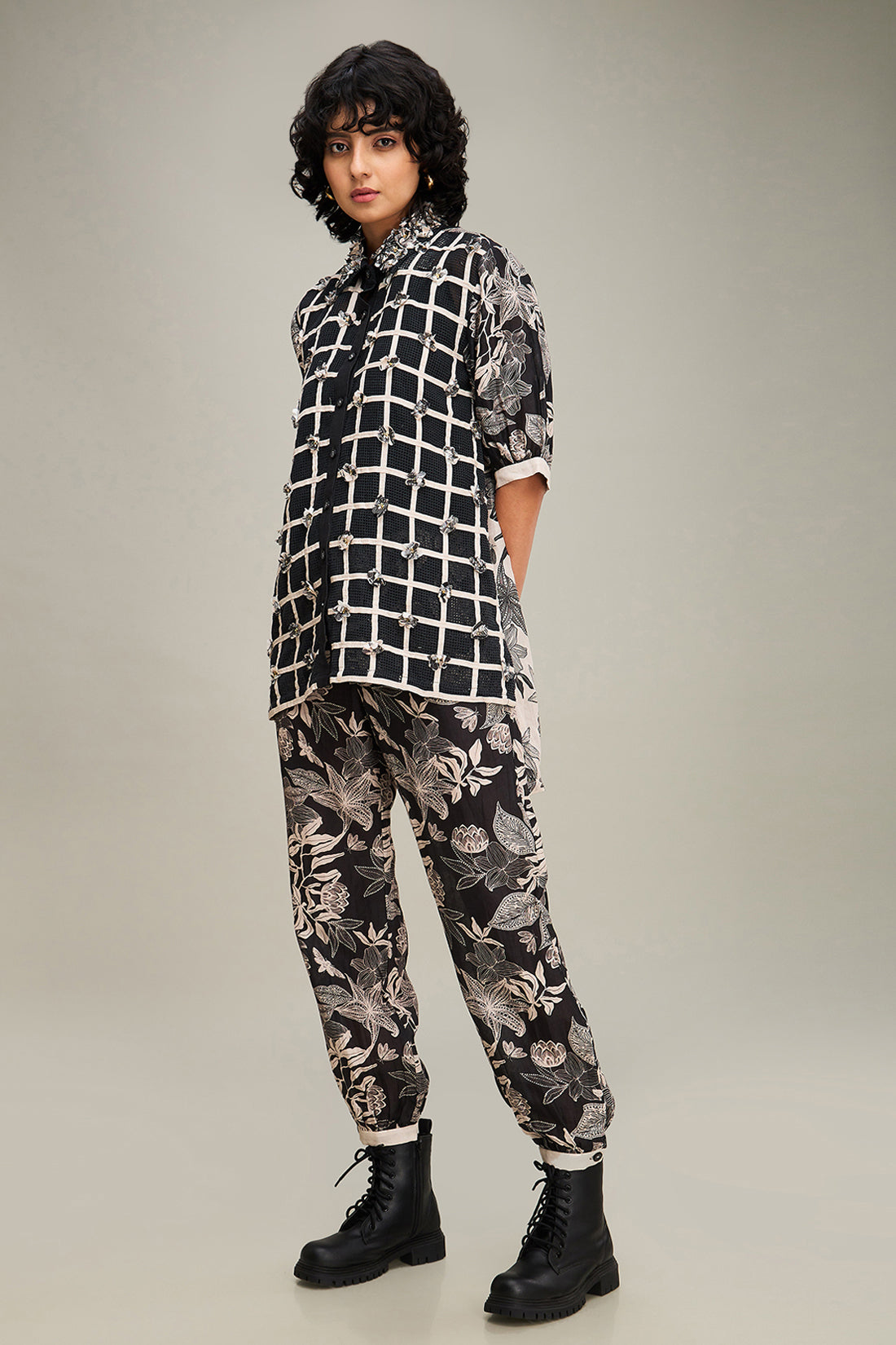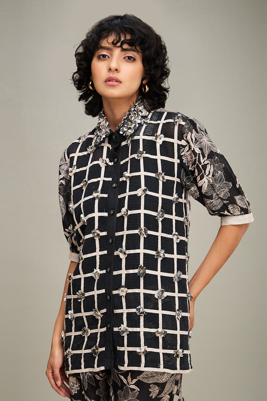 Black Ahyana Applique Long Shirt, Paired with Printed Pants in Linen.