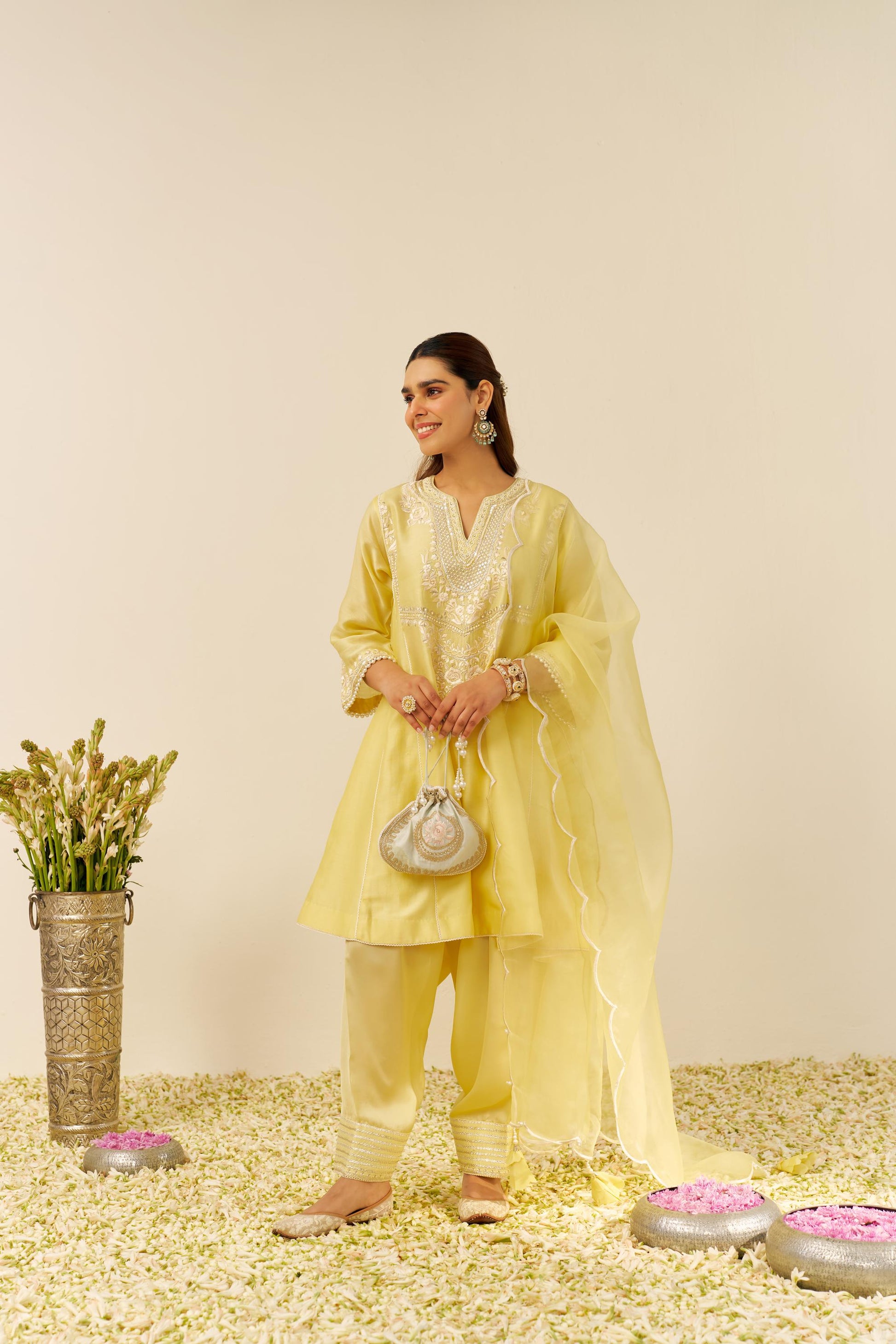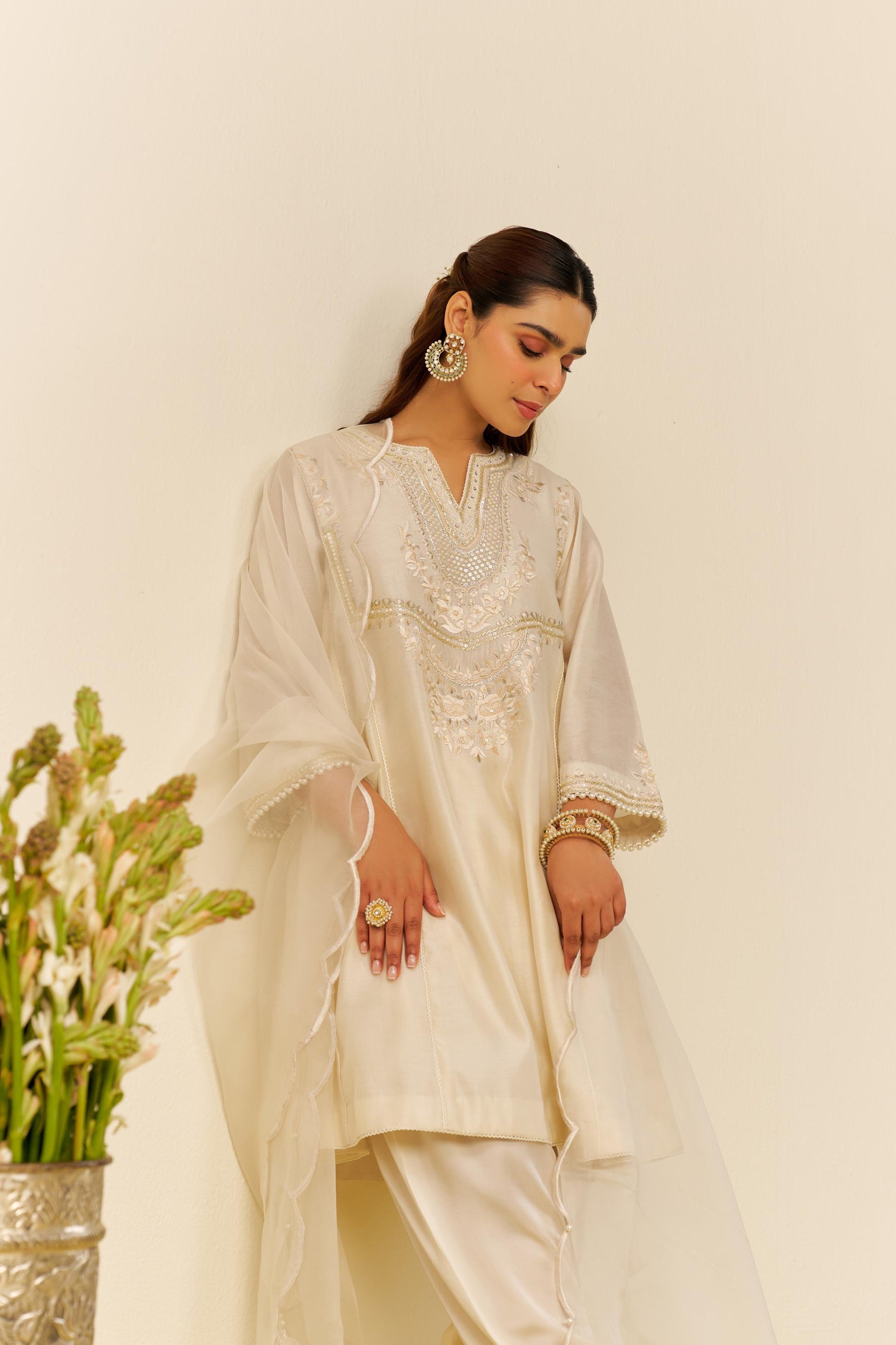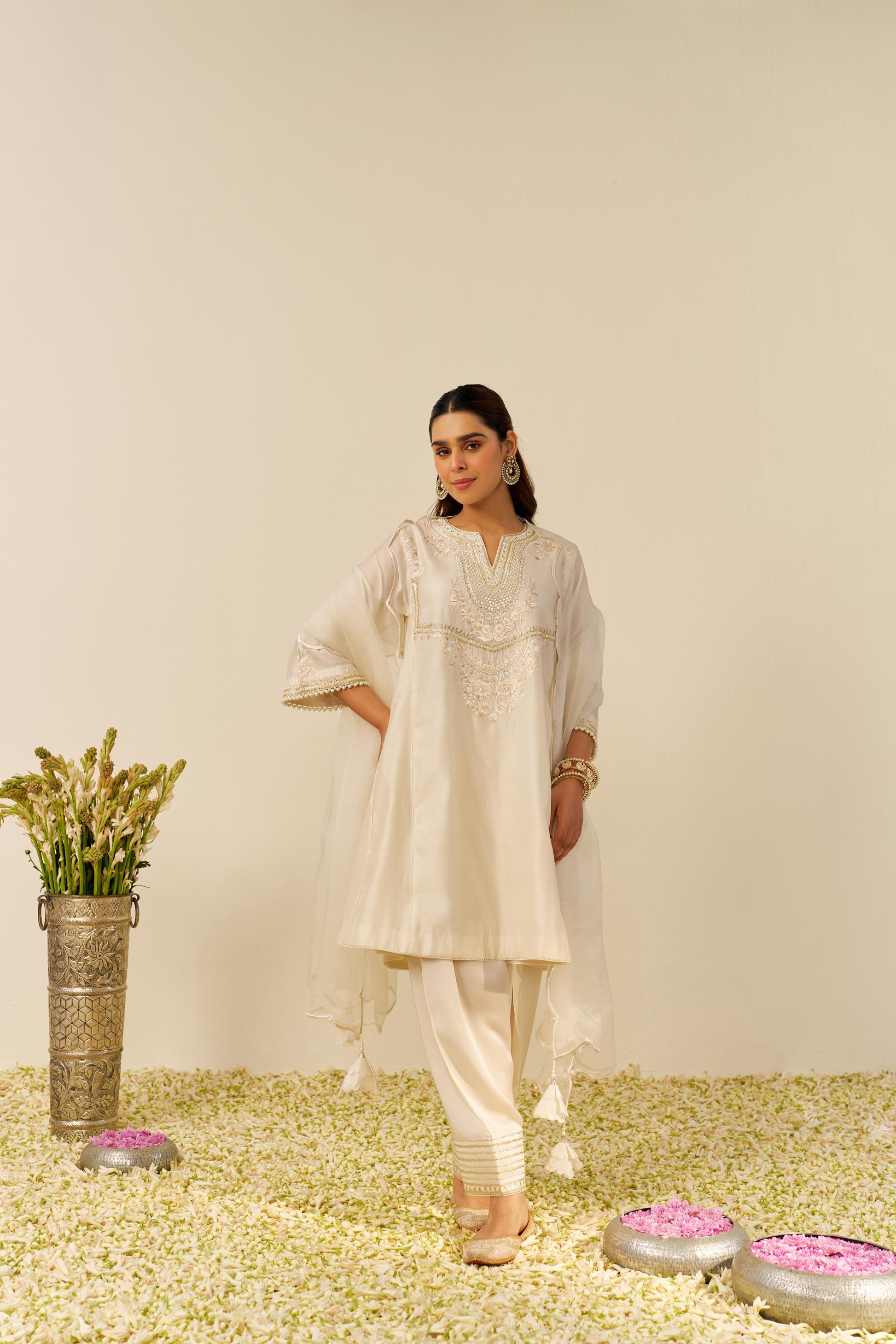 Paired With A Silk Organza Dupatta, Delicately Embroidered With Parsi Scalloped Patterns, Pearls, And Flower Danglings, This Creation Exudes Refined Charm. The Addition Of Tilla, Gota, And Pearl Embellishments Enhances The Overall Sophistication, Creating A Captivating Shimmer. Finished With The Finest Chanderi Silk, This Piece Is A True Work Of Art, Seamlessly Blending Heritage With A Contemporary Edge. A Statement Of Elegance And Style, This Ensemble Is Perfect For Those Who Appreciate Timeless Beauty With A Modern Twist.