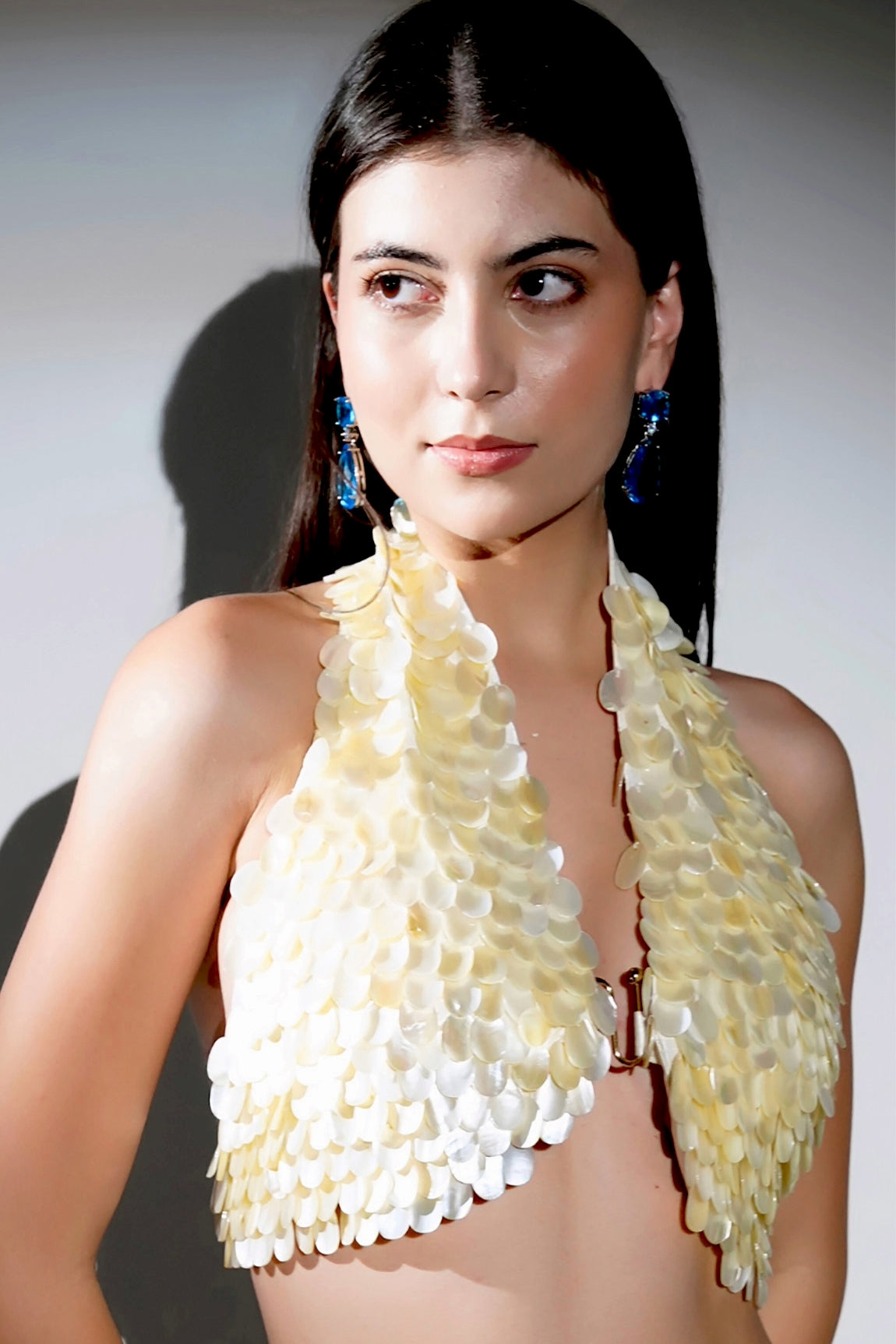Elevate Your Evening Look With The Alana Pearl Embellished Crop Top, Featuring Over 500 Luxurious Mother Of Pearl Embellishments. The Halter Neckline Accentuates Your Shoulders And Décolletage, While The Minimalist Back Ensures A Secure Fit. Pair It With High-Waisted Trousers Or A Flowing Skirt For A Captivating And Sophisticated Ensemble