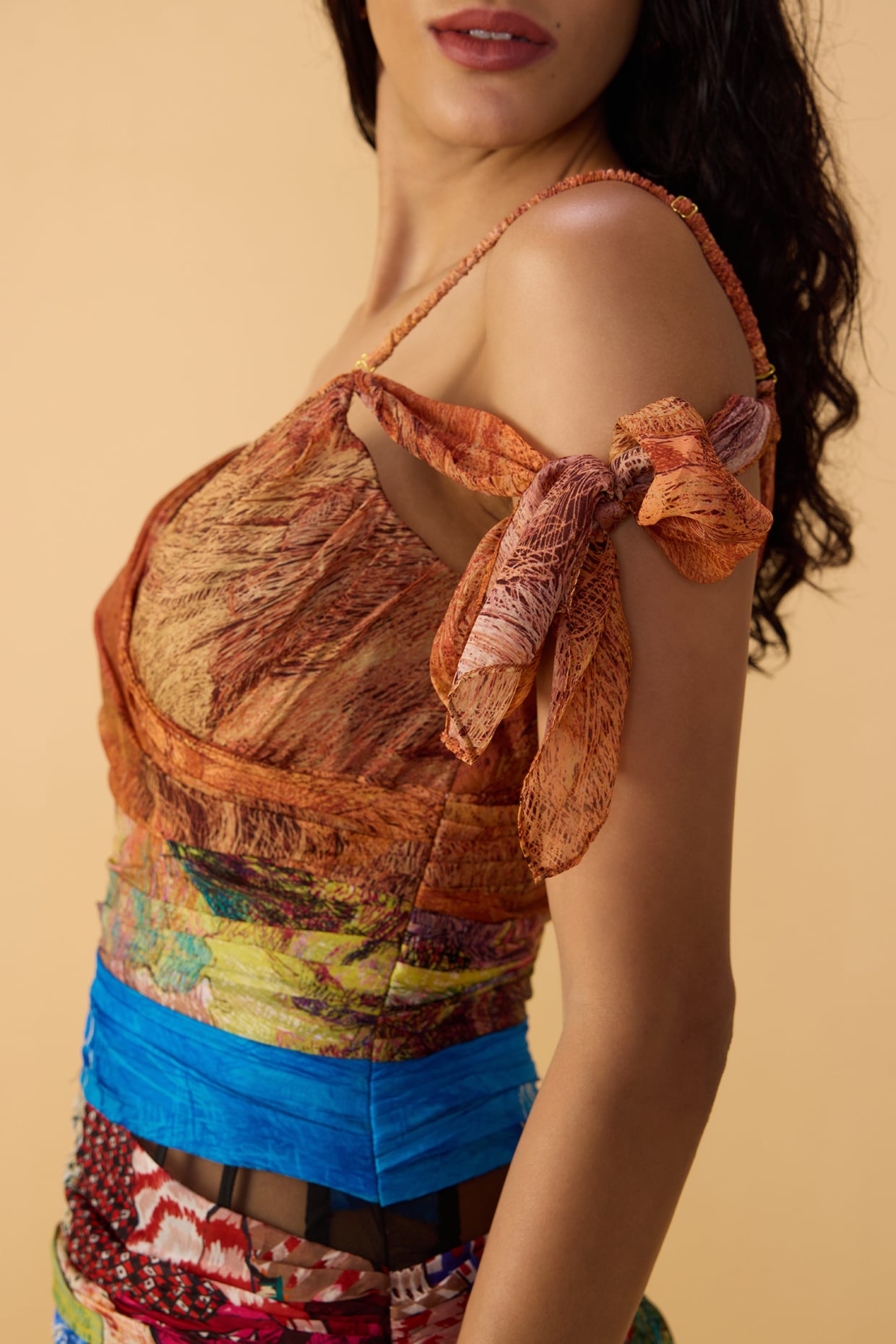 Multi Print Cold Shoulder Maxi Dress With Surplice Bodice, Gathered Waist And Side Keyhole Detailing.