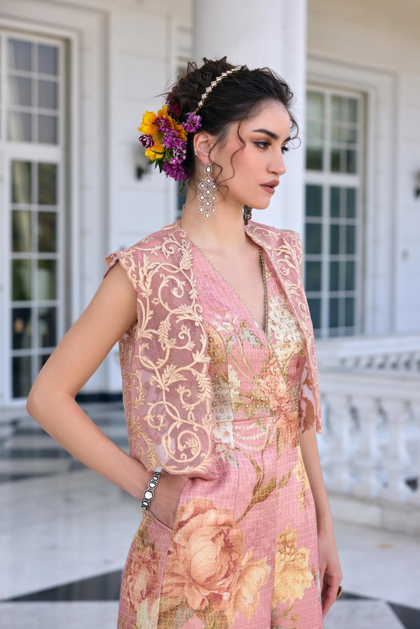 Step Into Sophistication With Alysa Brocade Jumpsuit, Complemented By Short Jacket .The Soft Intricate Detailing Of Embroidery On Jacket And Yoke To Flaunt Modern Allure And Charm. Perfect For Uber Chic Party Look.