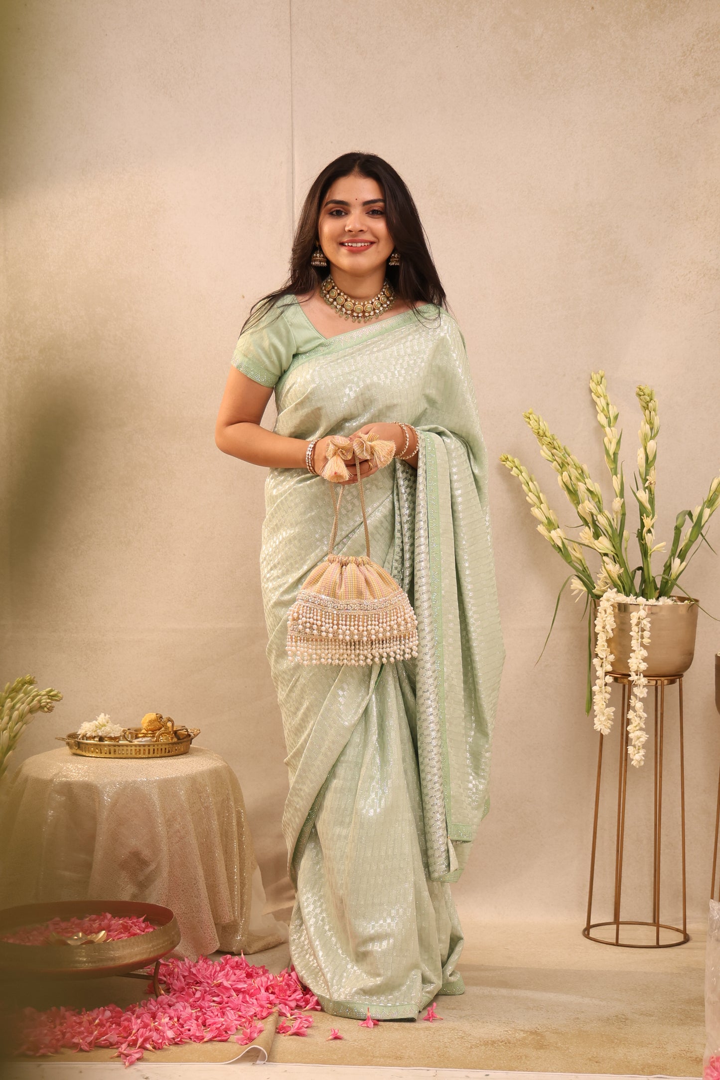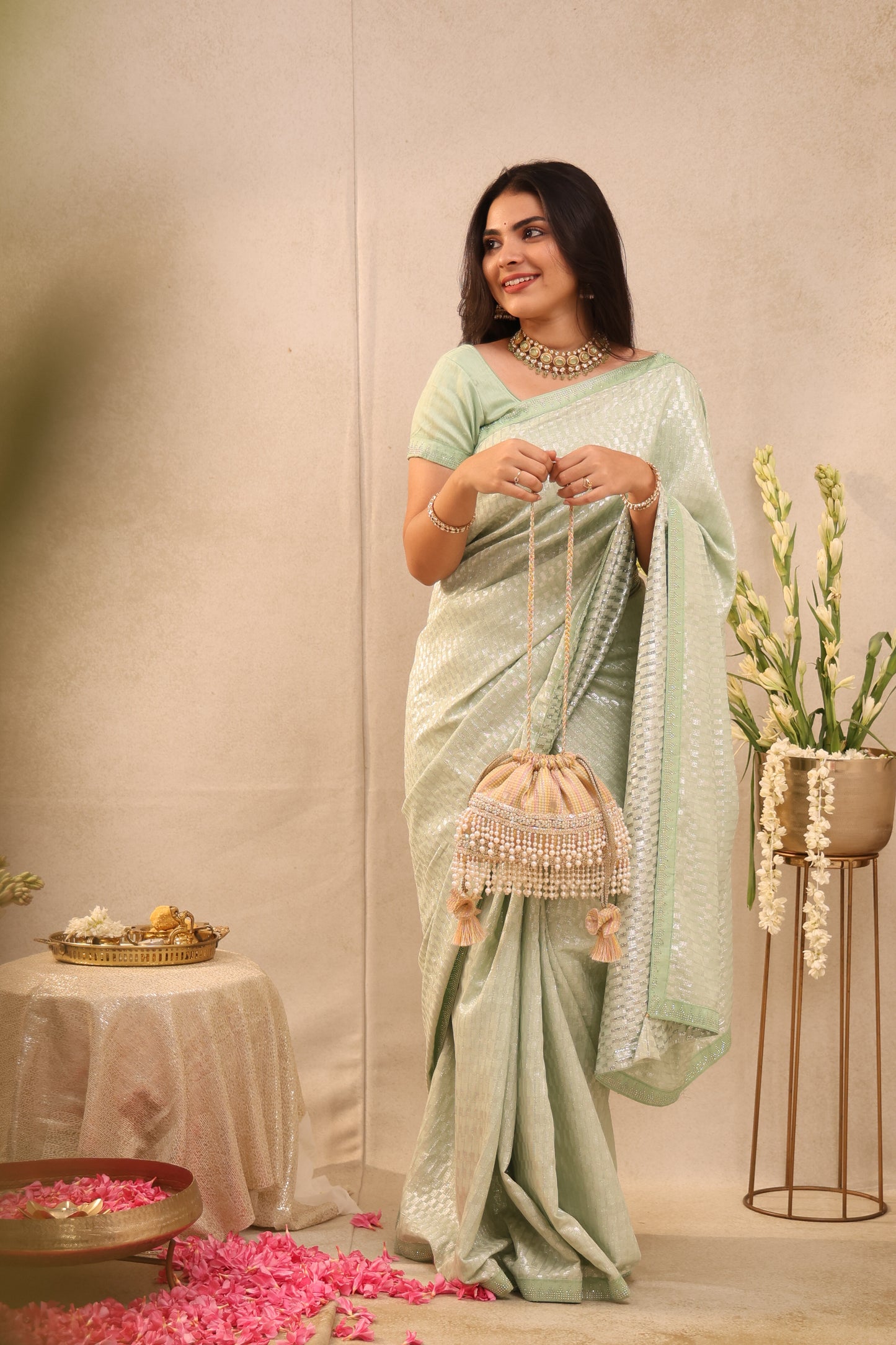 Add A Touch Of Elegance To Your Festive Look With This Multicolor Organza Potli Bag. Amari Multicolor Potli Features A Muted Mix Of Colors, Making It The Perfect Accessory For Any Festive Occasion. The Bag Is Adorned With A Stunning Double Pearl Fringe Lace Along The Edges, Giving It A Luxurious And Sophisticated Finish.
