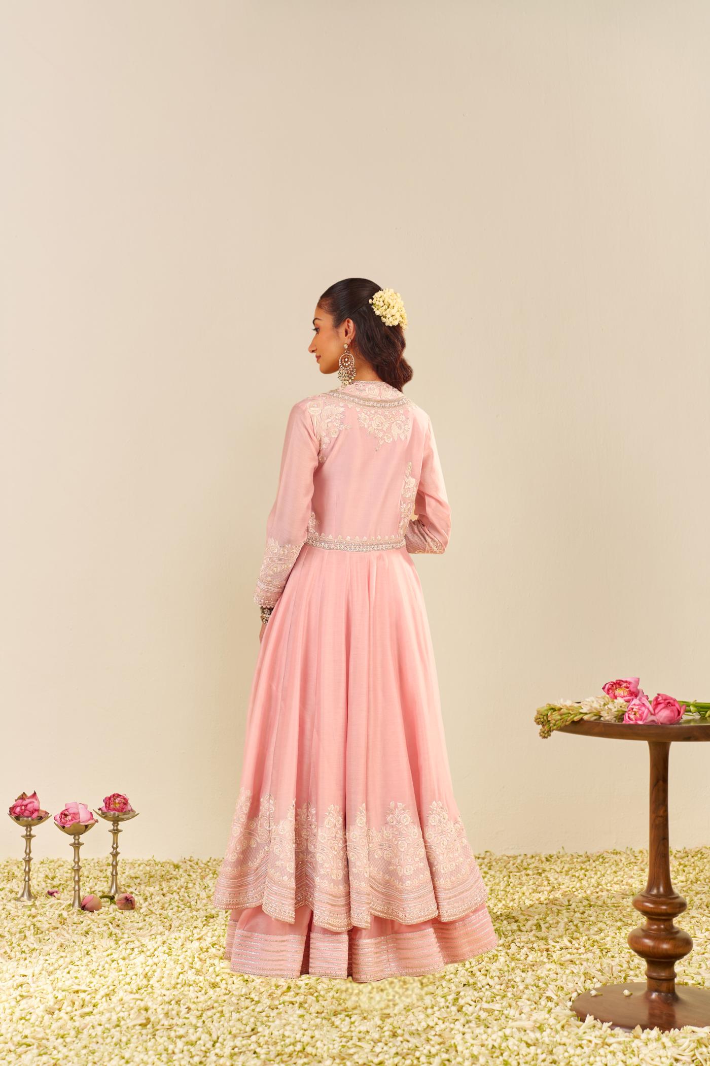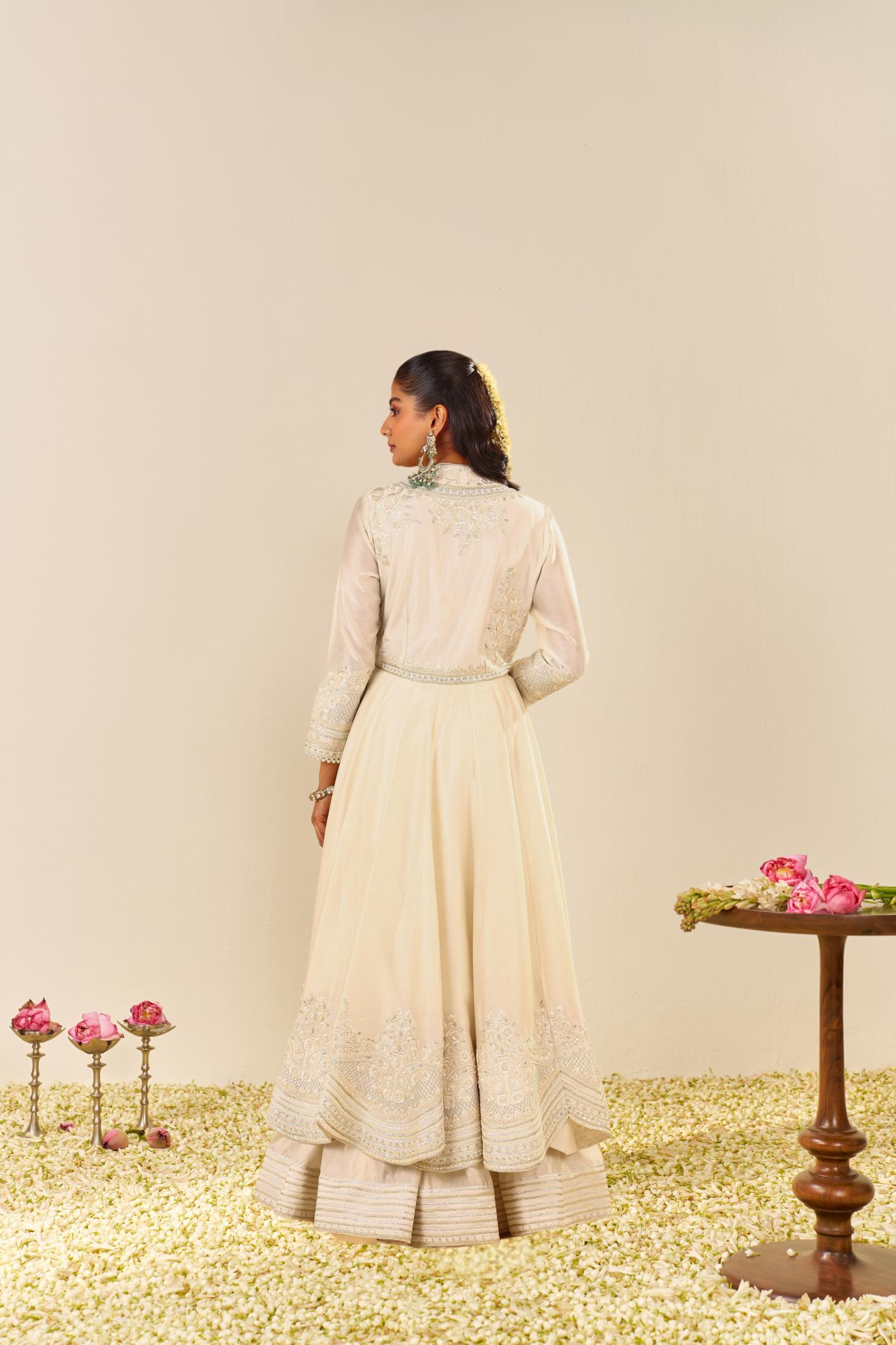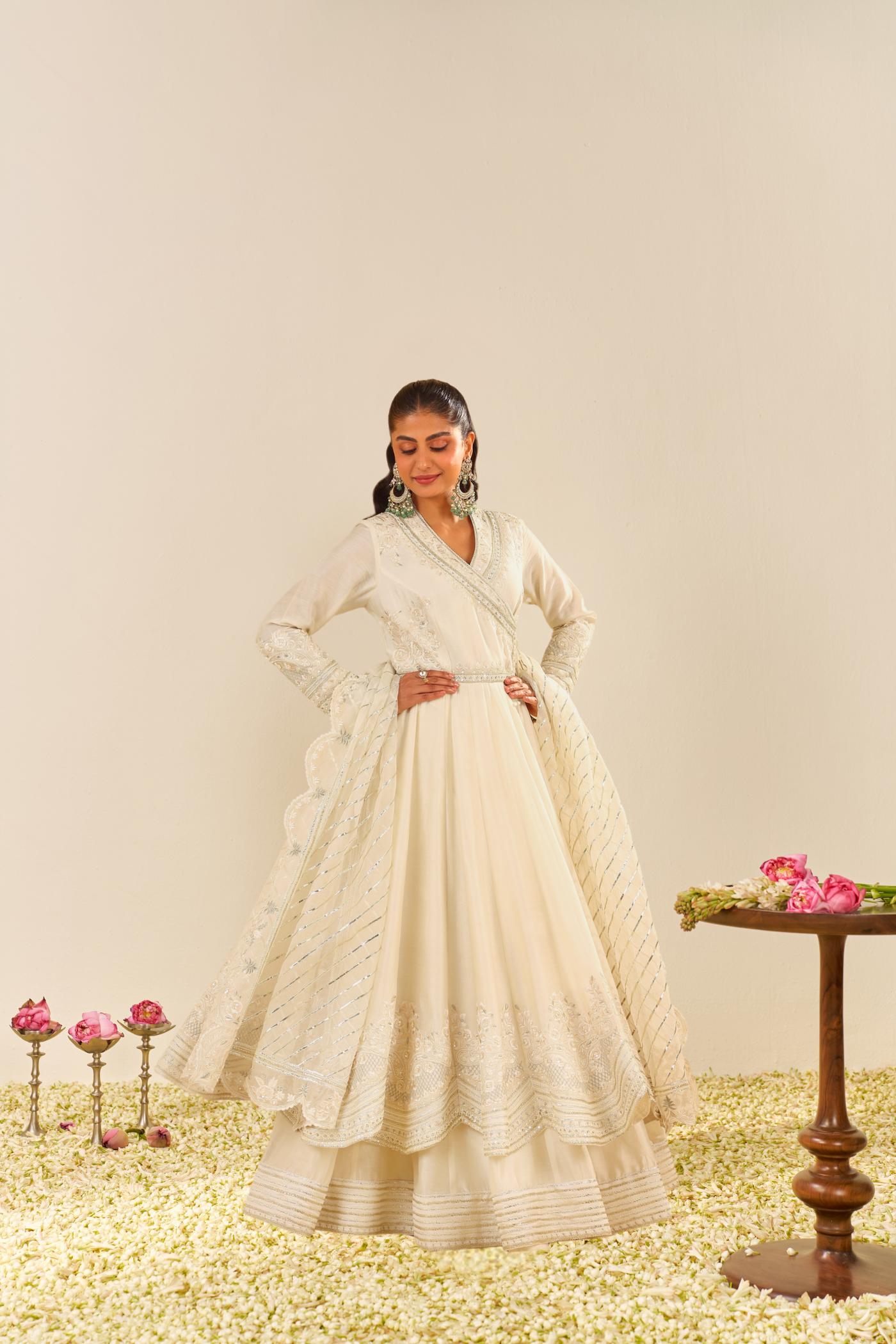 This Stunning Angrakha Long-Length Kalidaar Anarkali Is Crafted From Pure Silk Chanderi Fabric, Exuding A Luxurious And Graceful Appeal. The Ensemble Is Beautifully Teamed With A Silk Chanderi Skirt And A Delicate Silk Organza Dupatta, Offering A Perfect Balance Of Opulence And Elegance. The Anarkali Features A Sophisticated V-Neck At The Front, A Chic Zero-Back Design, And Three-Quarter Sleeves, Blending Modern Style With Timeless Tradition.