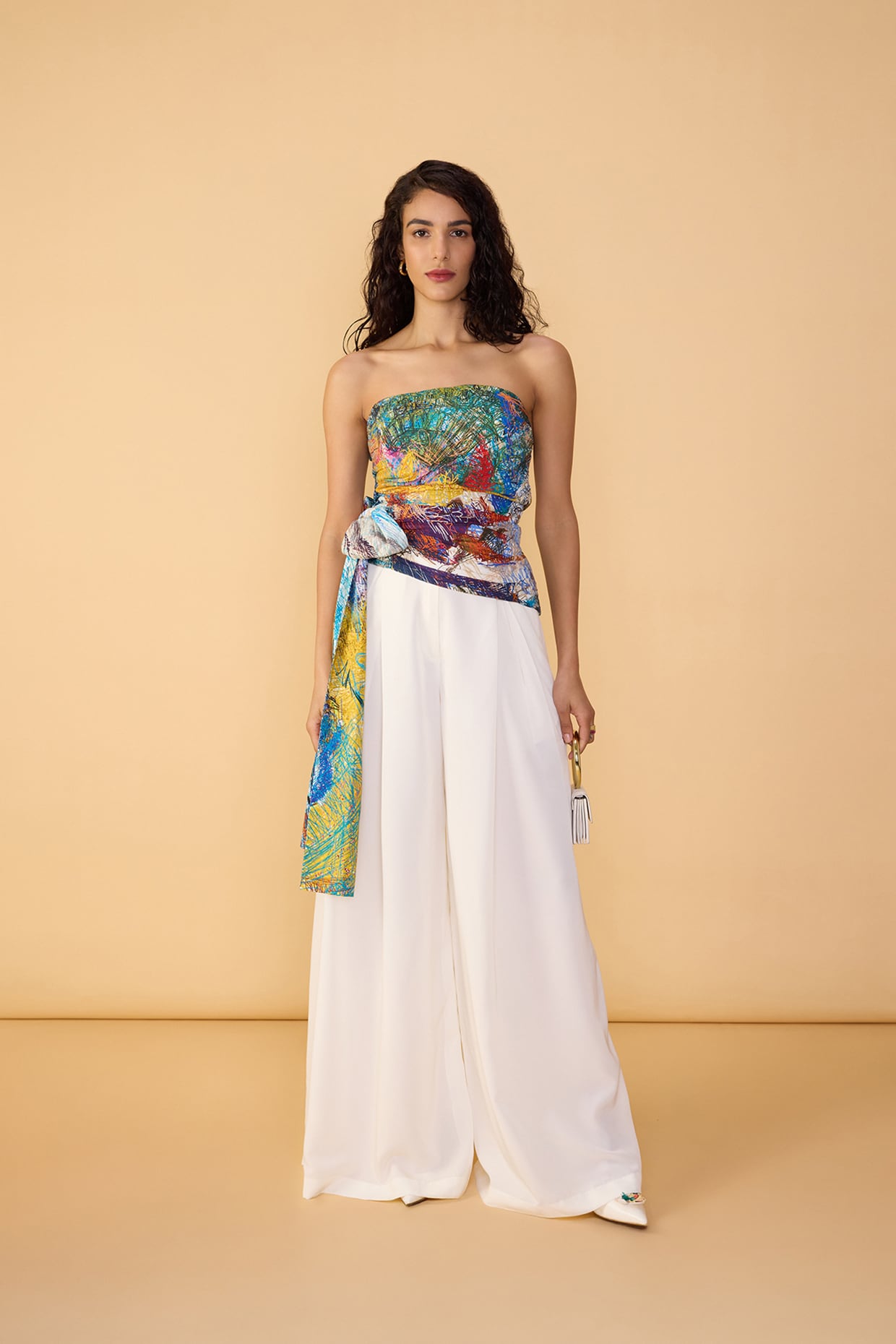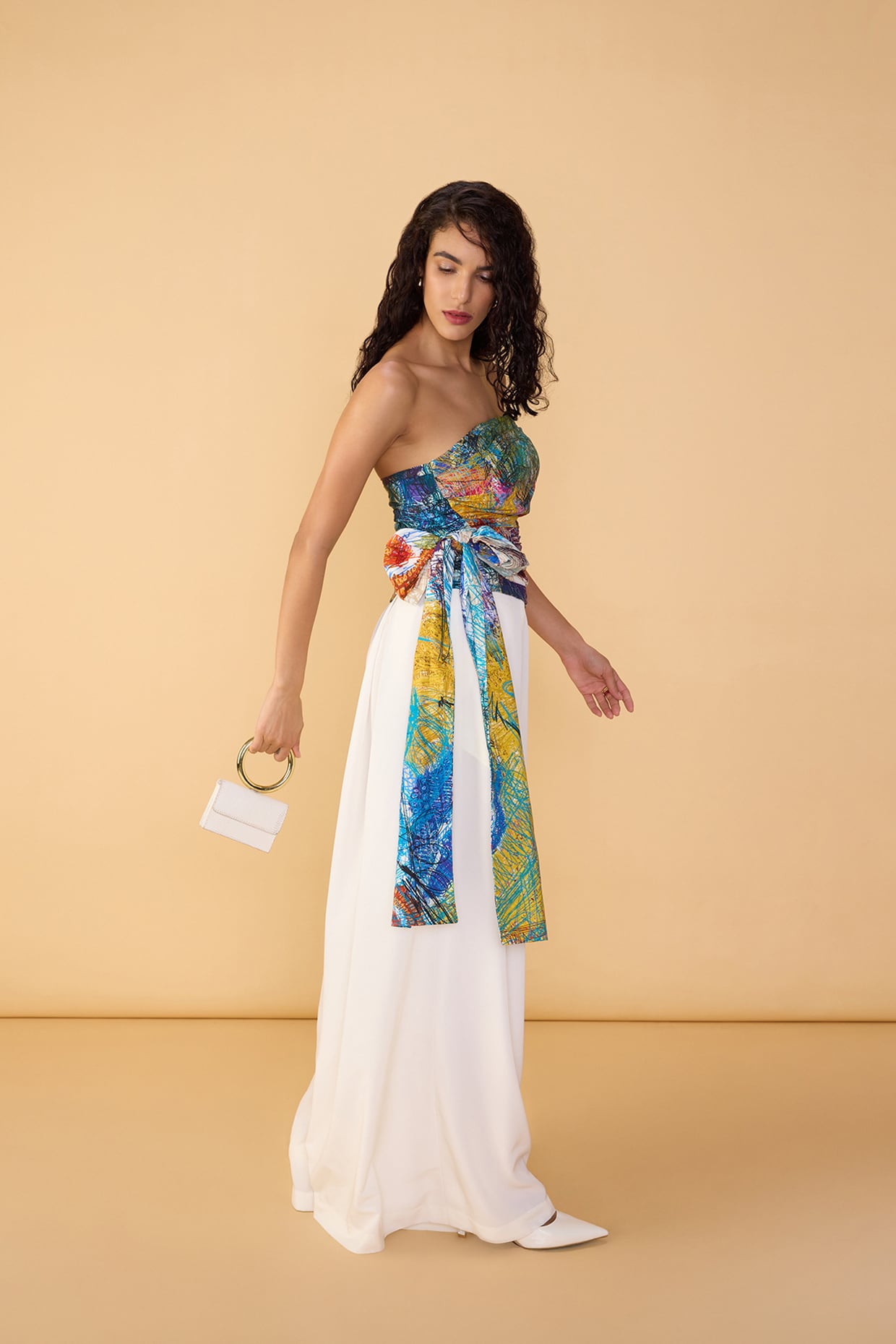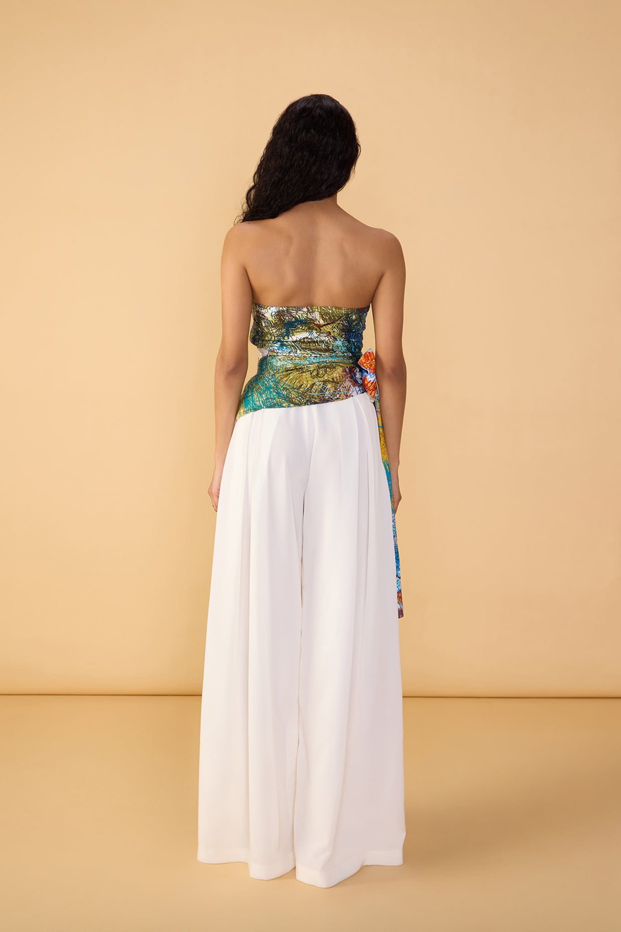 Blouse : Abstract Scribble Print Strapless, Asymmetric Pleated Blouse With Side Bow Detailing