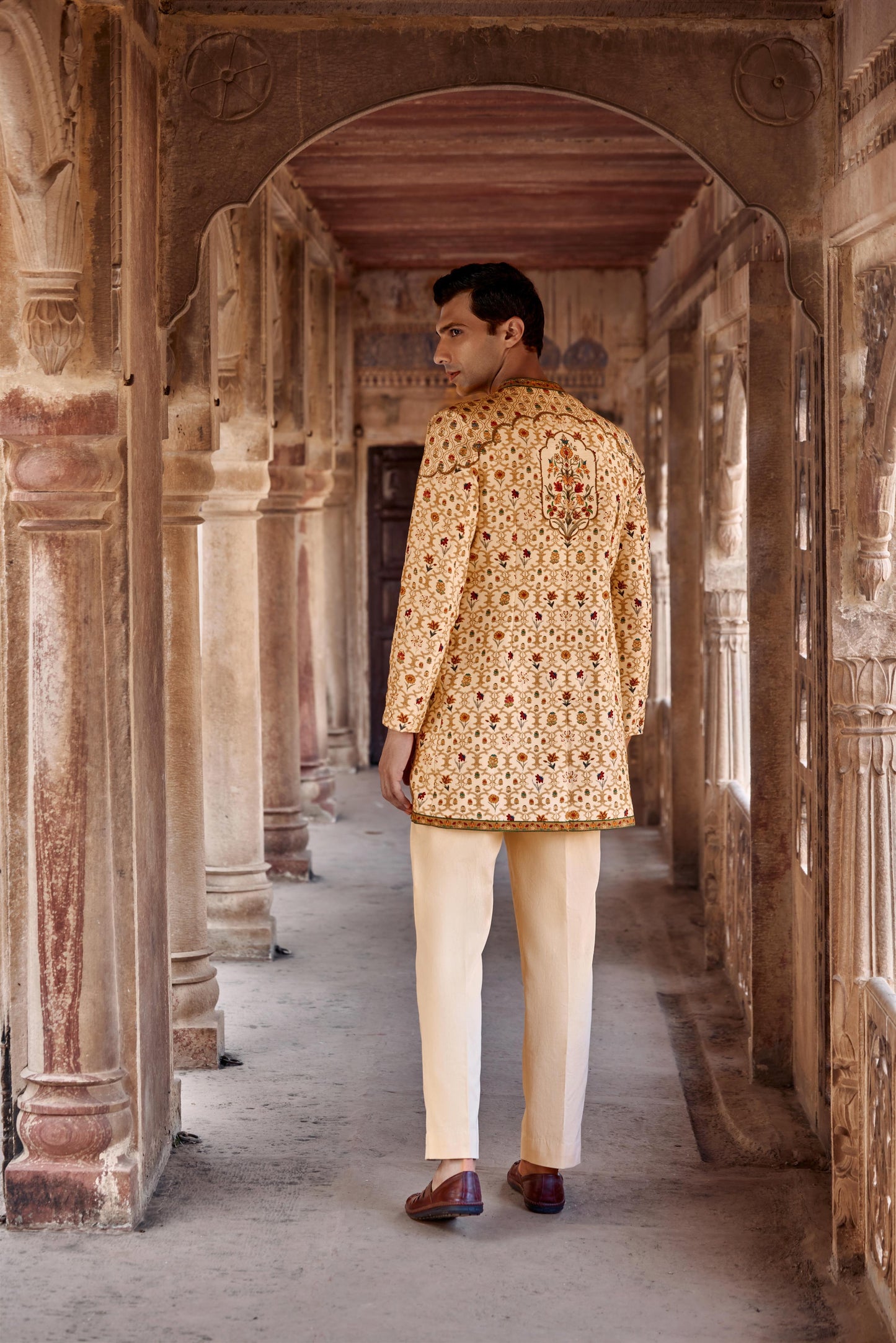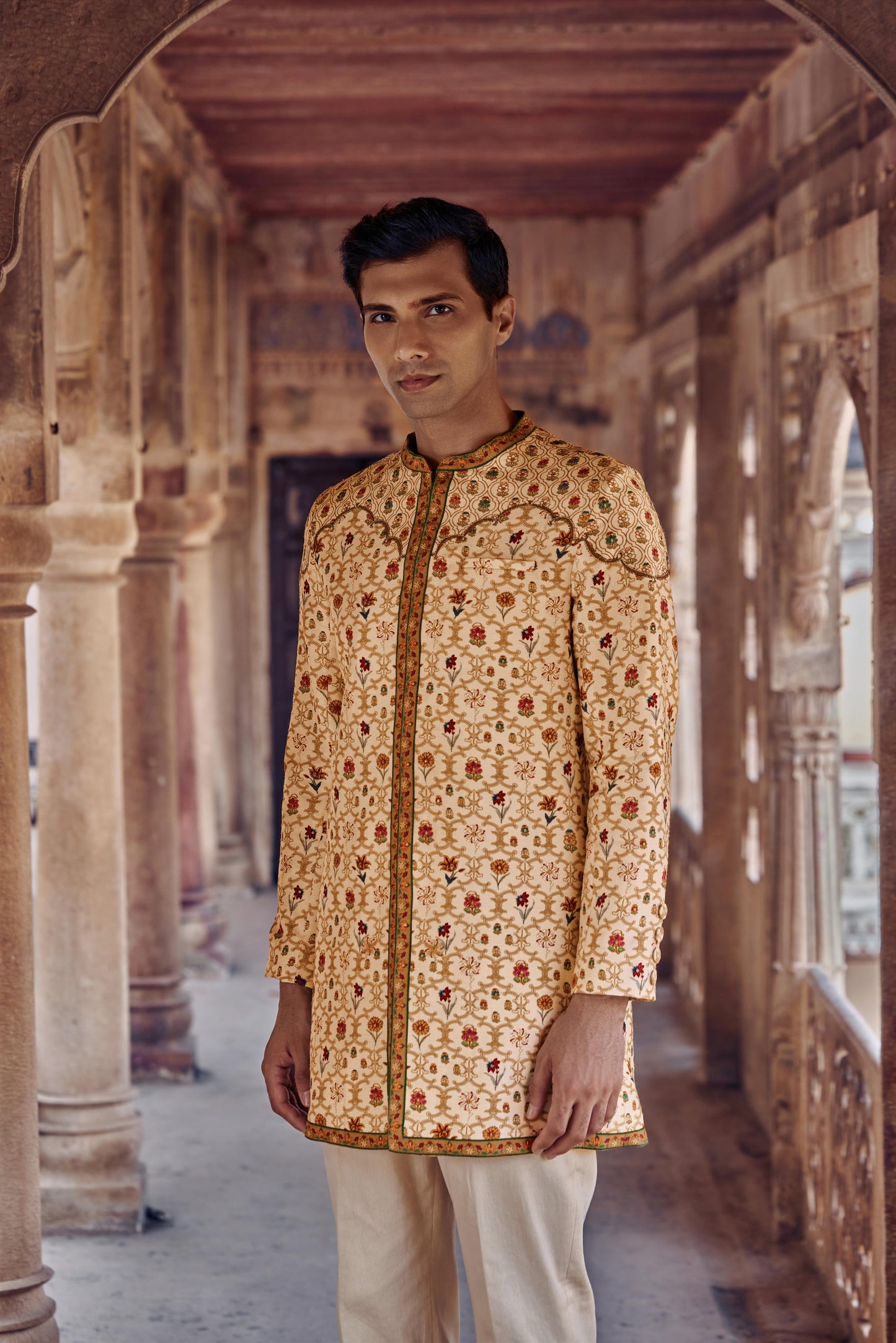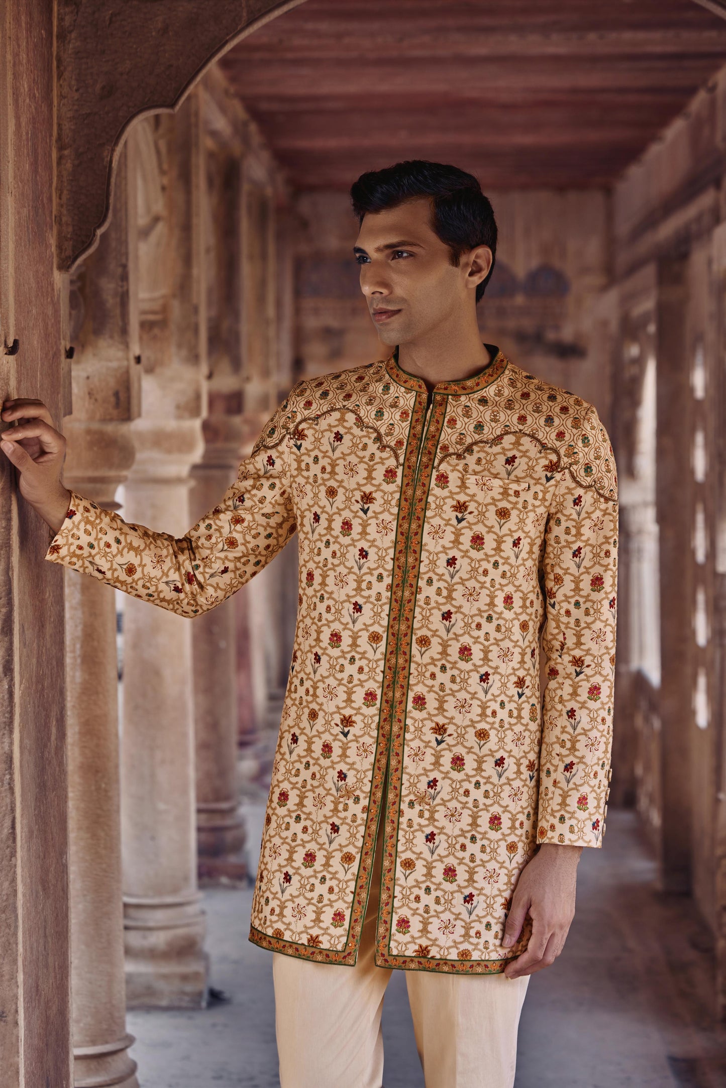 Indulge In Elegance In Our Classic Amir Achkan Set. Classic Vintage Paisley Design All Over. Embraced With Neck Band And Placket Perfect For That Contemporary Indian Look.