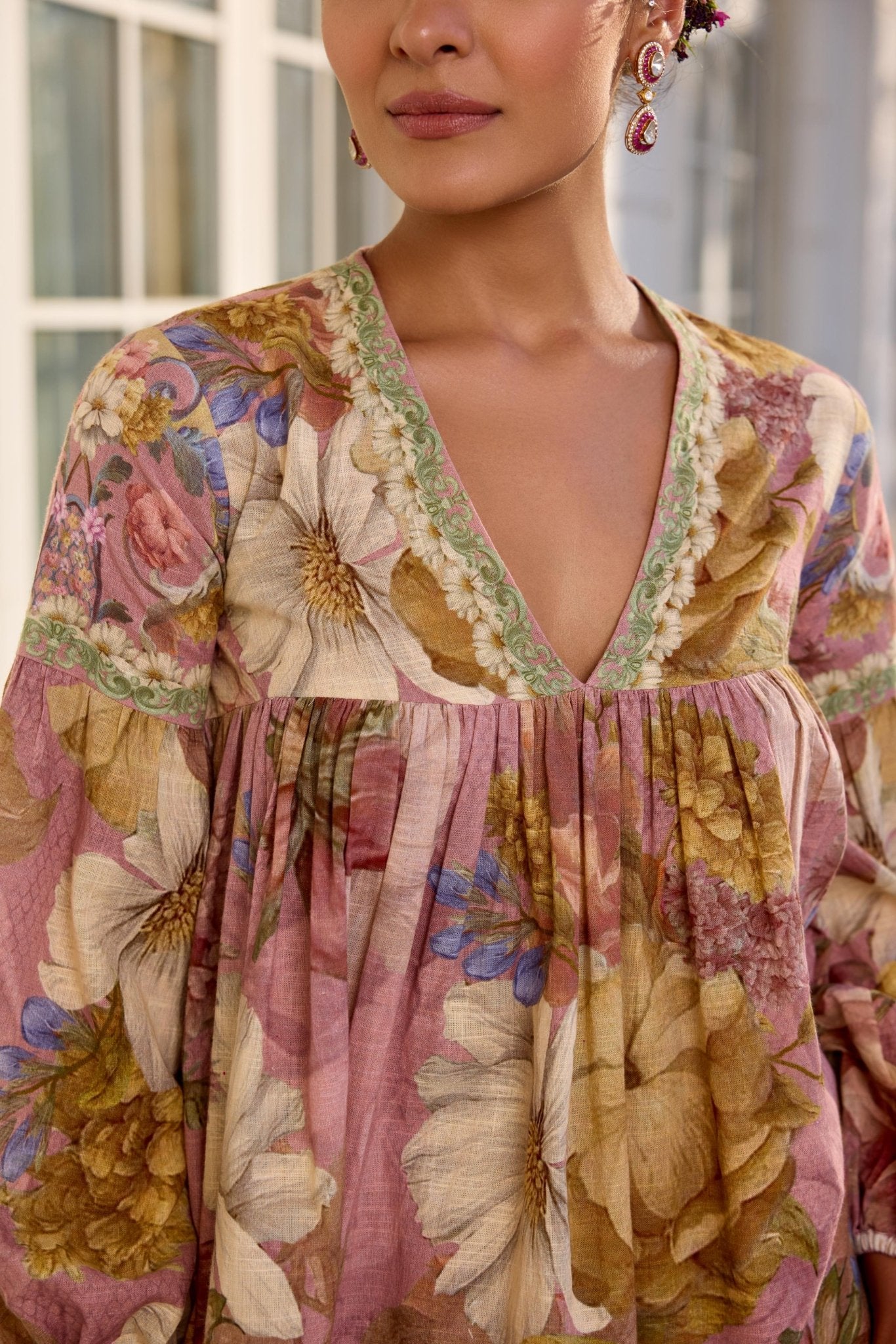 Indulge In The Grace Of Anaisha Co-Ord Set, Boasting A Refined Floral Vintage Print In V- Shaped Neck Lined Pleated Top , Comes With Graceful Bishop Sleeves And Pants, Epitomizing Modern Sophistication With A Touch Of Classic Charm. Perfect For Your Summer Outings.