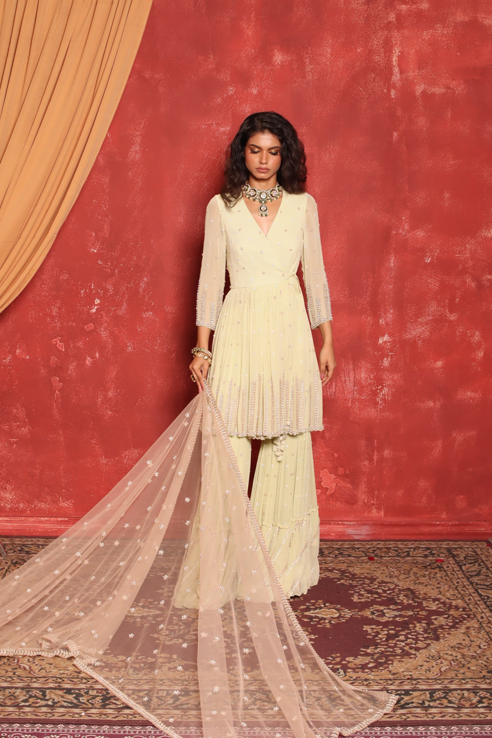 Whimsical & Wonderful! This Angrakha Kurta Set With Detailed Katdana Embroidery & Frill-Detailed Sharara Is The Epitome Of Refinement. The Light, Airy Outfit, Perfect For Any Special Occasion Screams Glamour.