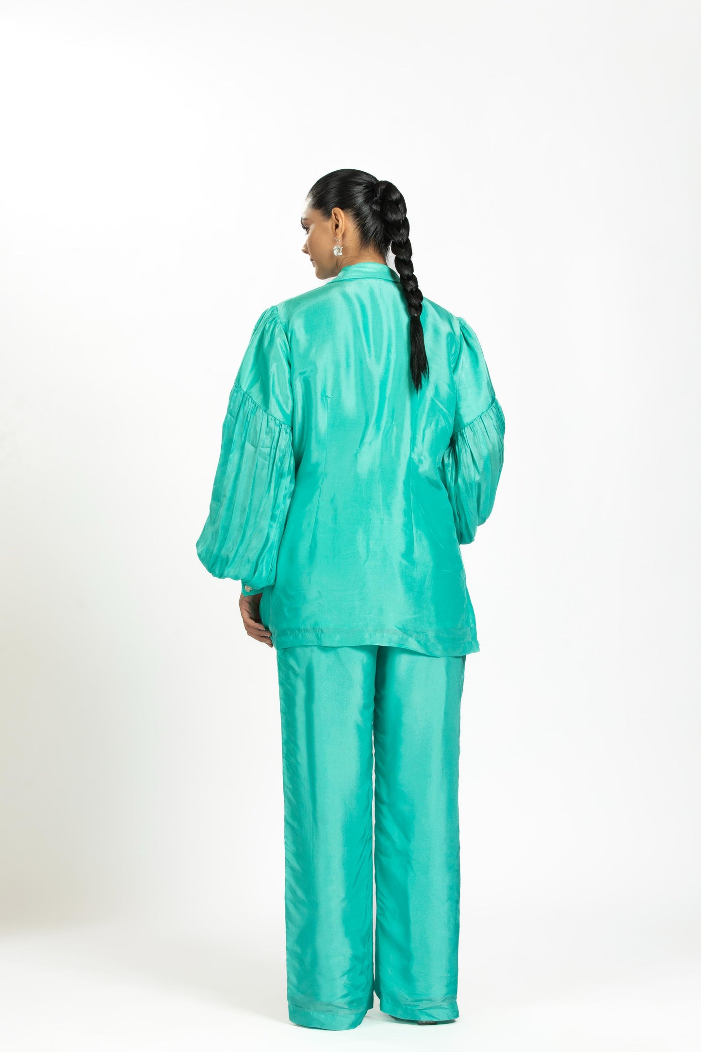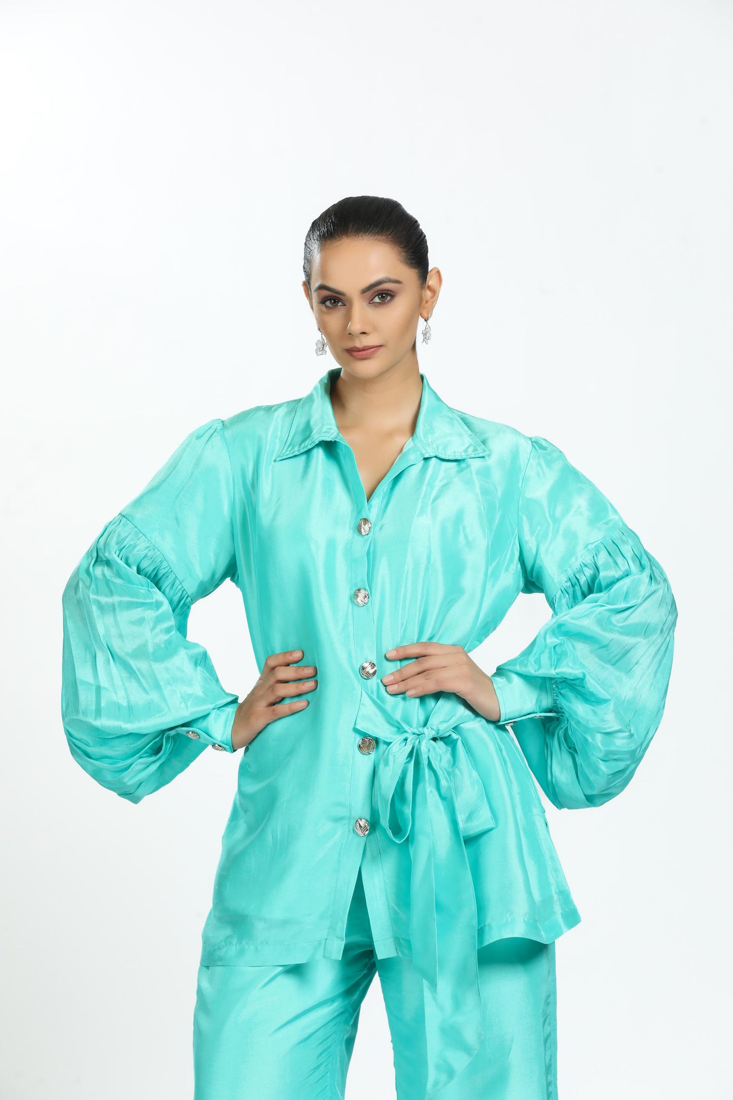 The Aqua Bamboo Silk Cordset Features A Fancy Shirt With Silver Buttons, An Attached One-Sided Belt, And Matching Pants. This Modern, Stylish Outfit With A Touch Of Luxury Is Perfect For Chic Events, Upscale Parties, And Special Occasions Where Elegance Is Key.