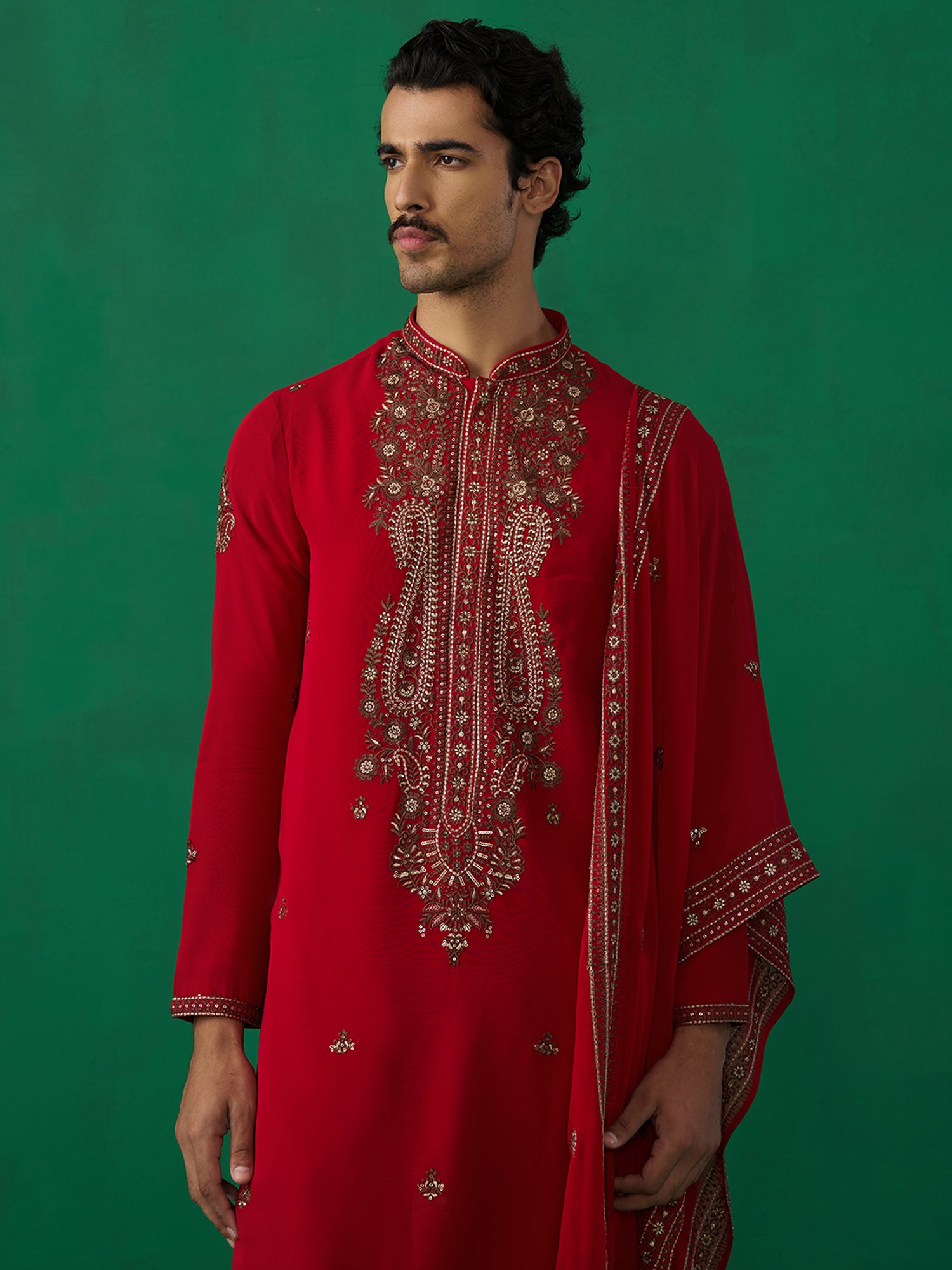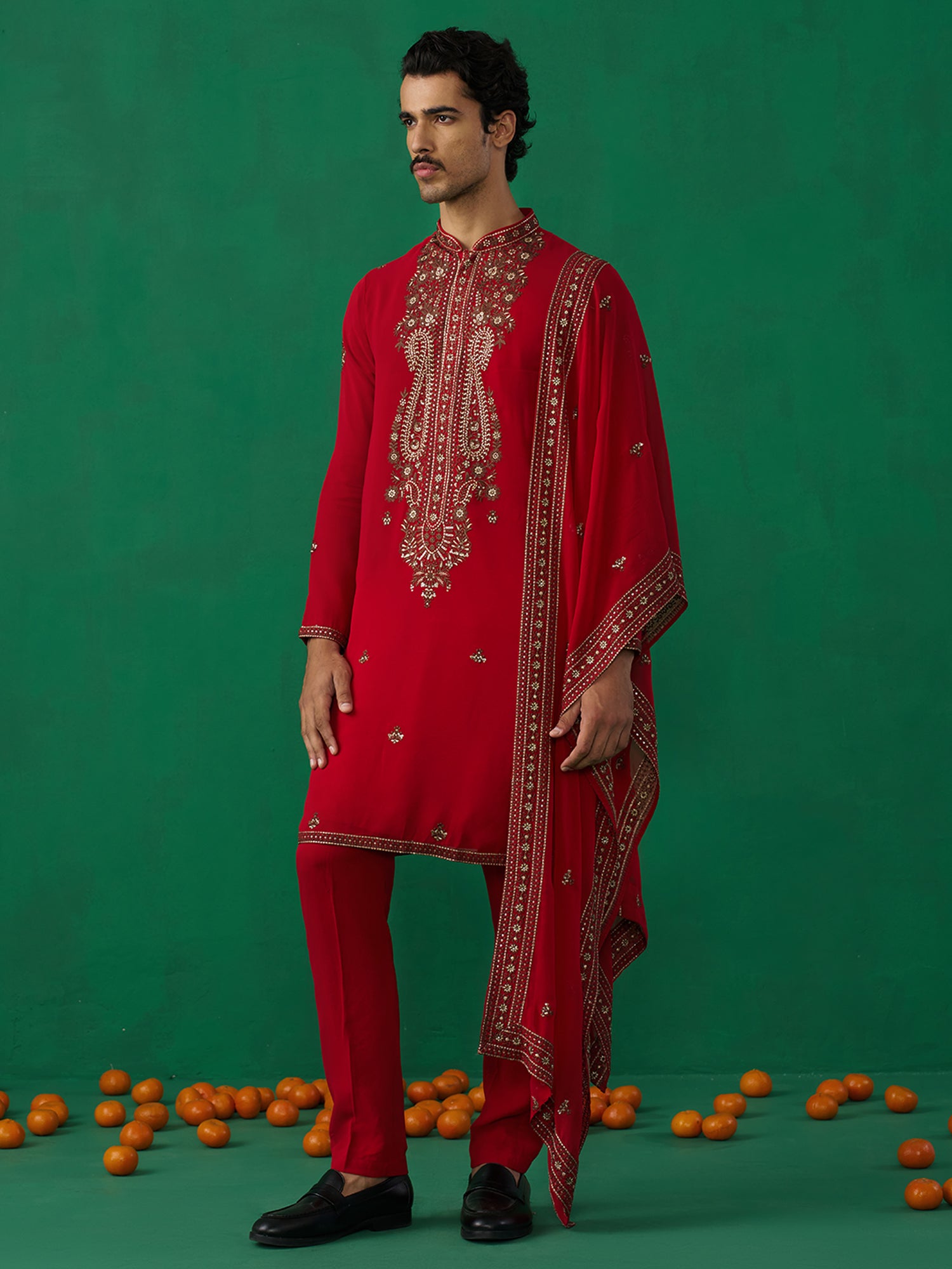 This Kurta Set Features A Long-Sleeved Kurta With A Prominent, Elaborate Embroidery On The Front Placket And Neckline, Crafted In An Arabic Style. The Detailed Pattern Extends Vertically Down The Center Of The Garment. The Sleeves Are Also Adorned With Small Embroidered Motifs. The Set Includes A Pair Of Straight-Cut Trousers And A Long Dupatta With An Embroidered Border That Mirrors The Arabic-Style Pattern Of The Kurta.