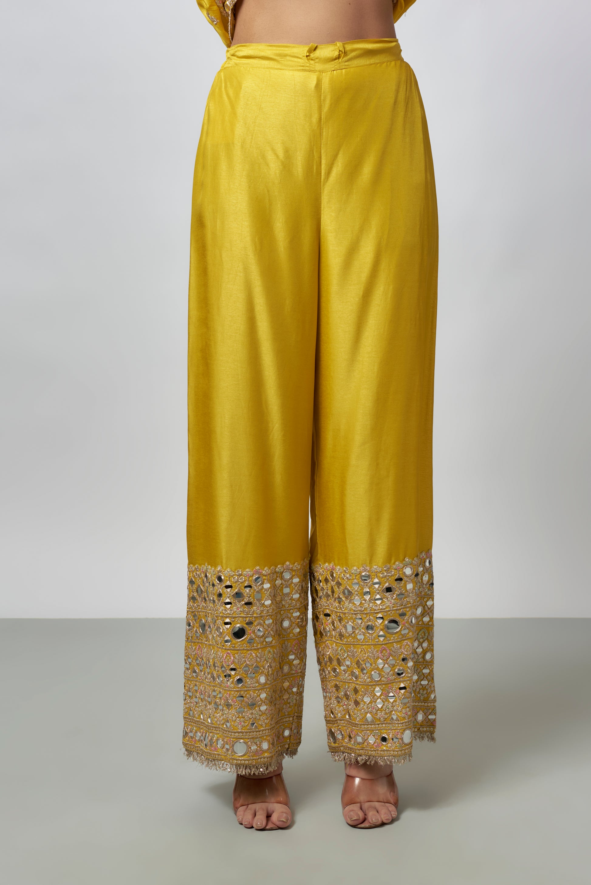 The Outfit Features A Long, Flowy Silhouette With Intricate Mirror Work And Embroidery Adorning The Yoke, Sleeves, And Hemline. Includes Sharara And Dupatta With A Scalloped Border, Heavily Detailed With Shimmering Mirror Accents And Embroidery.
