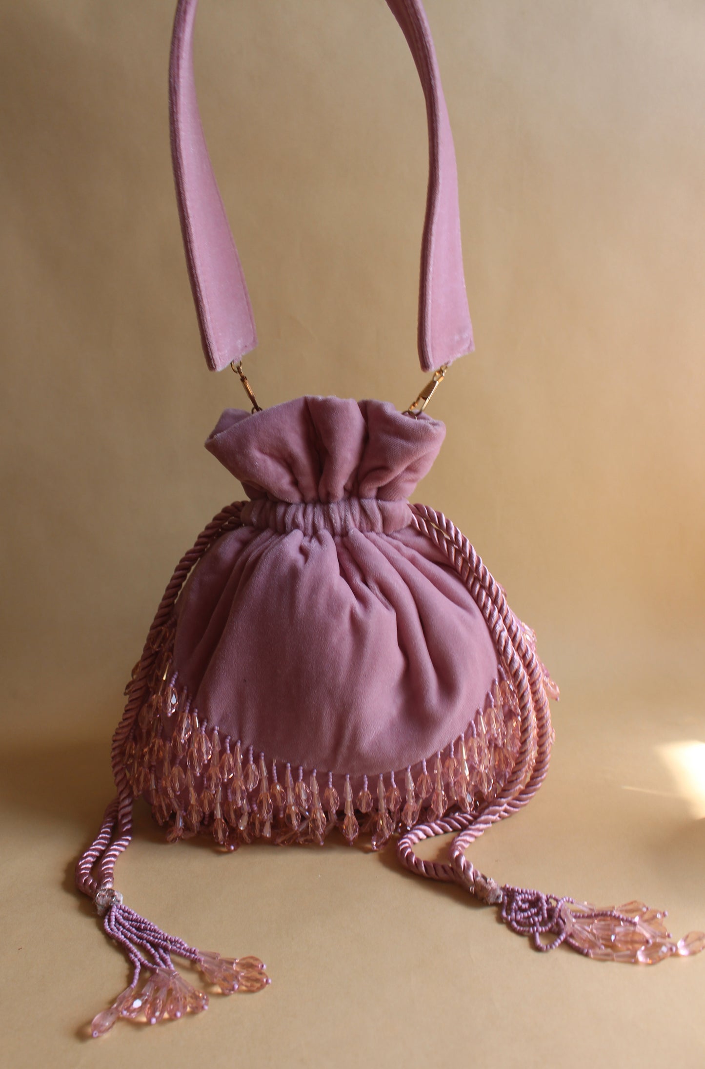 Hand Embroidered Rose Pink Potli Based On Velvet Is Beautified With Pearl Work And Crystal Drop tassels On Both Sides. It Is Paired With A Detachable Handle.