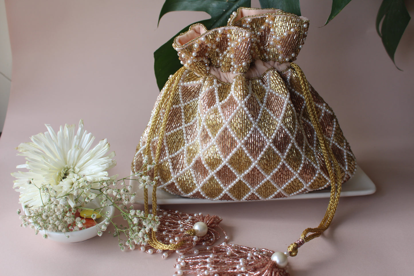 Hand Embroidered Shaded Rose Pink And Gold Potli Based On Silk Is Encrusted With Salli Work And Intricate Criss-Cross Pearl Detailing On Both Sides With Tassels Giving A Finishing Touch.