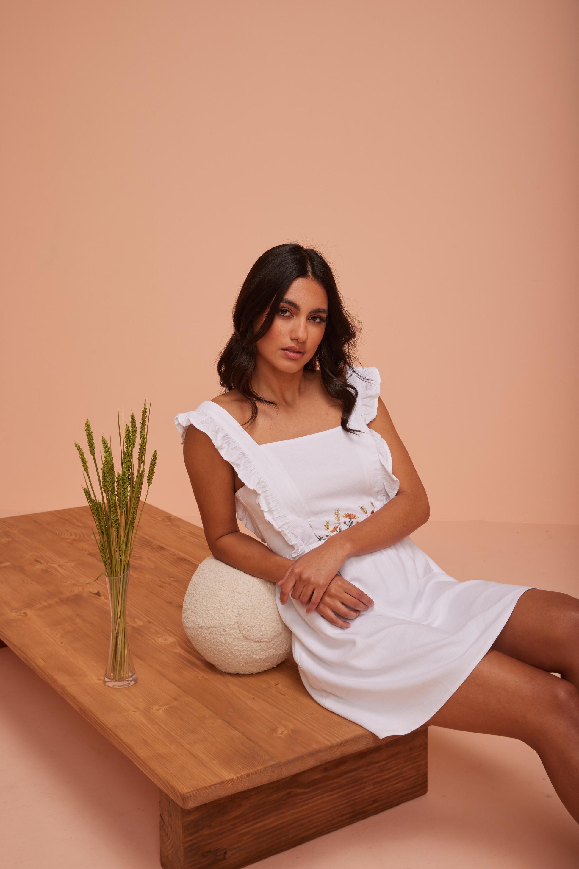 This Oh-So-Sweet White Linen Dress Is The Perfect Choice For Any Day Or Night Occasion, Featuring A Super-Flirty Short Hem And Ruffled Sleeveless Top, Making It Easy To Mix And Match With Your Favorite Bomber Or Denim Jacket For Cooler Temps. Look And Feel Good Wearing This Pretty Design Crafted With Eco-Friendly Materials.