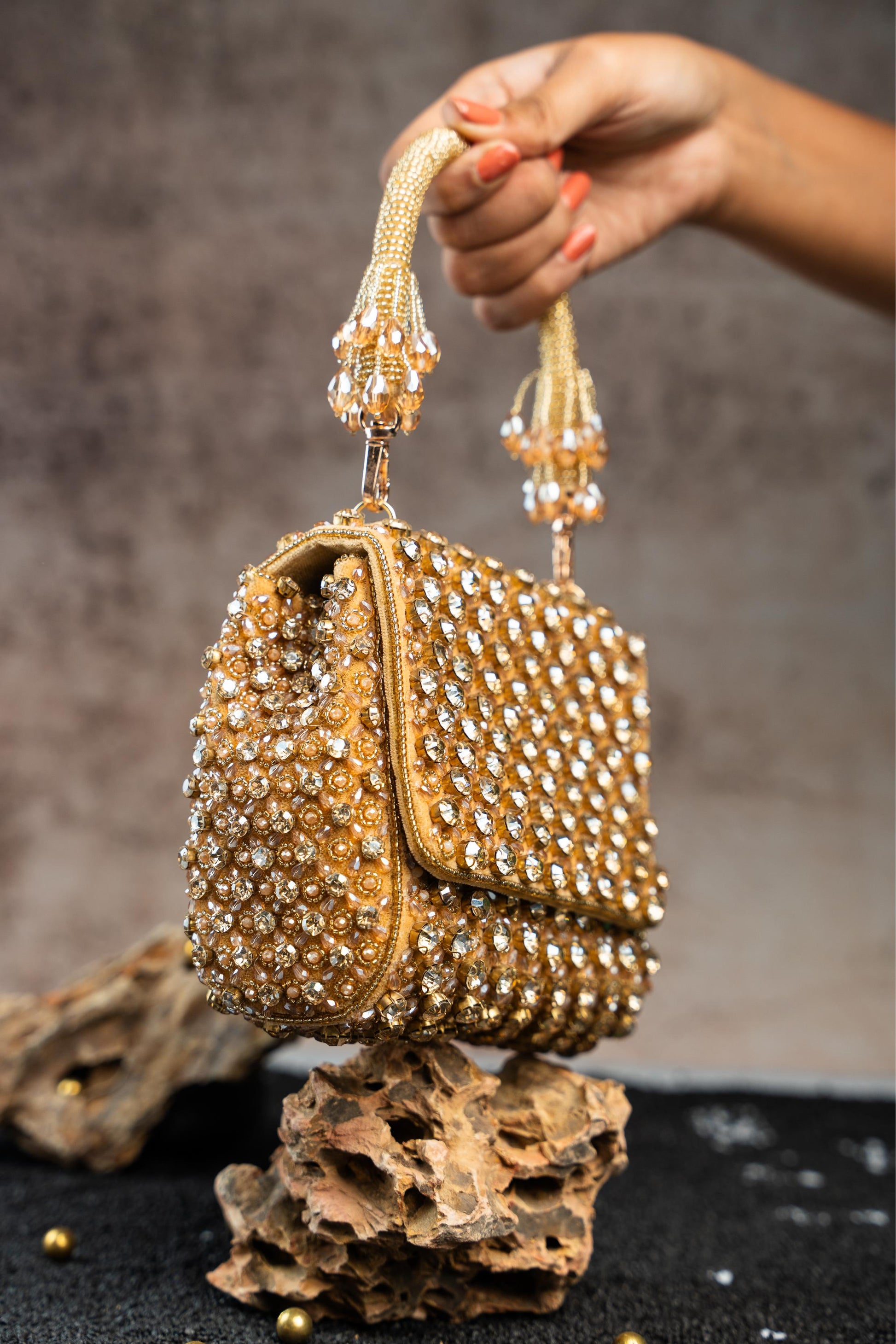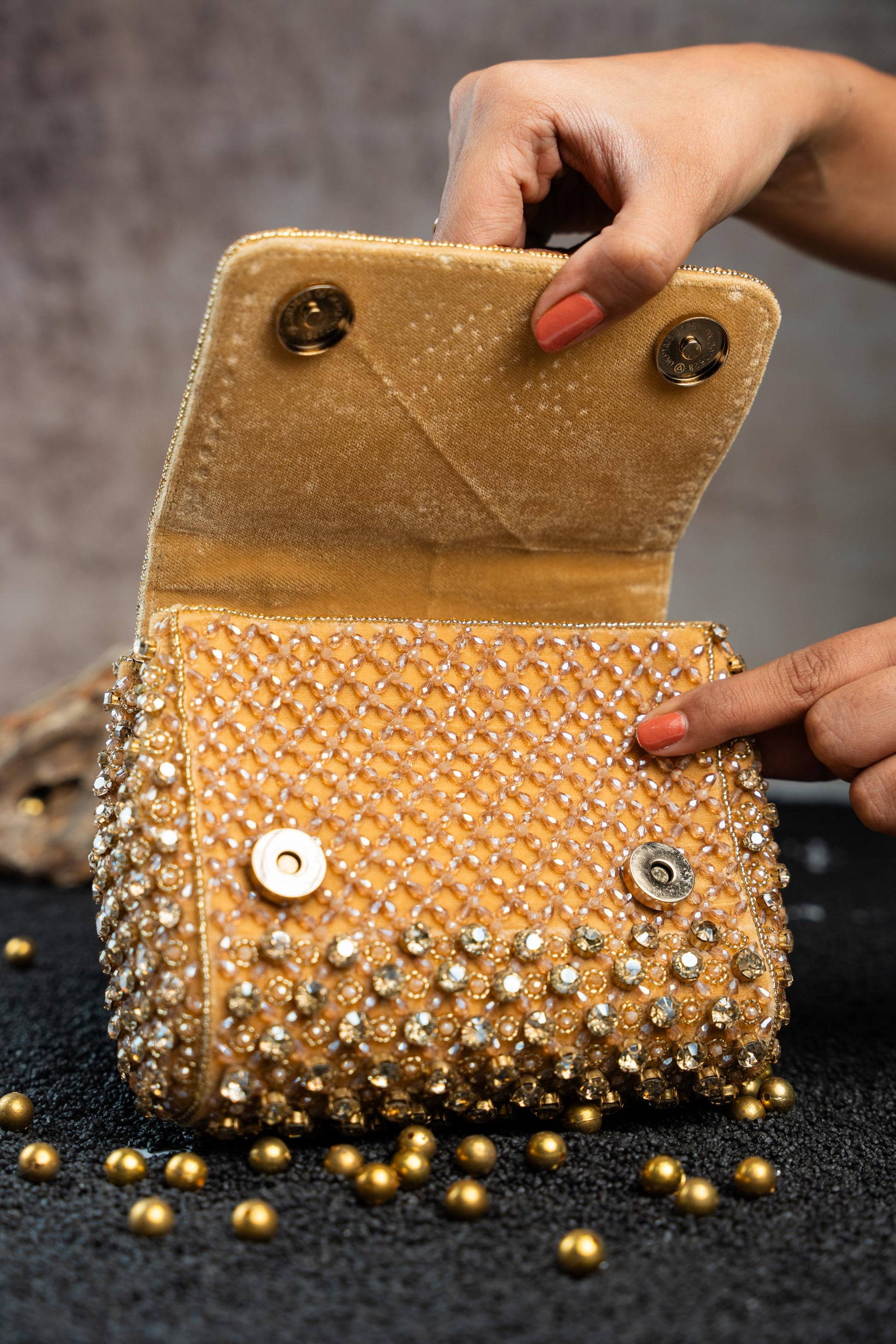 A Gold Mini Bag Adorned With Shimmering Crystals And Intricate Bead Work. Perfect For Adding A Touch Of Elegance And Sparkle To Any Special Occasion, This Clutch Blends Traditional Artistry With A Modern, Sophisticated Design. Comes With A Dazzling Beaded Handle Finish Making It A Convenient And Fashionable Addition.
