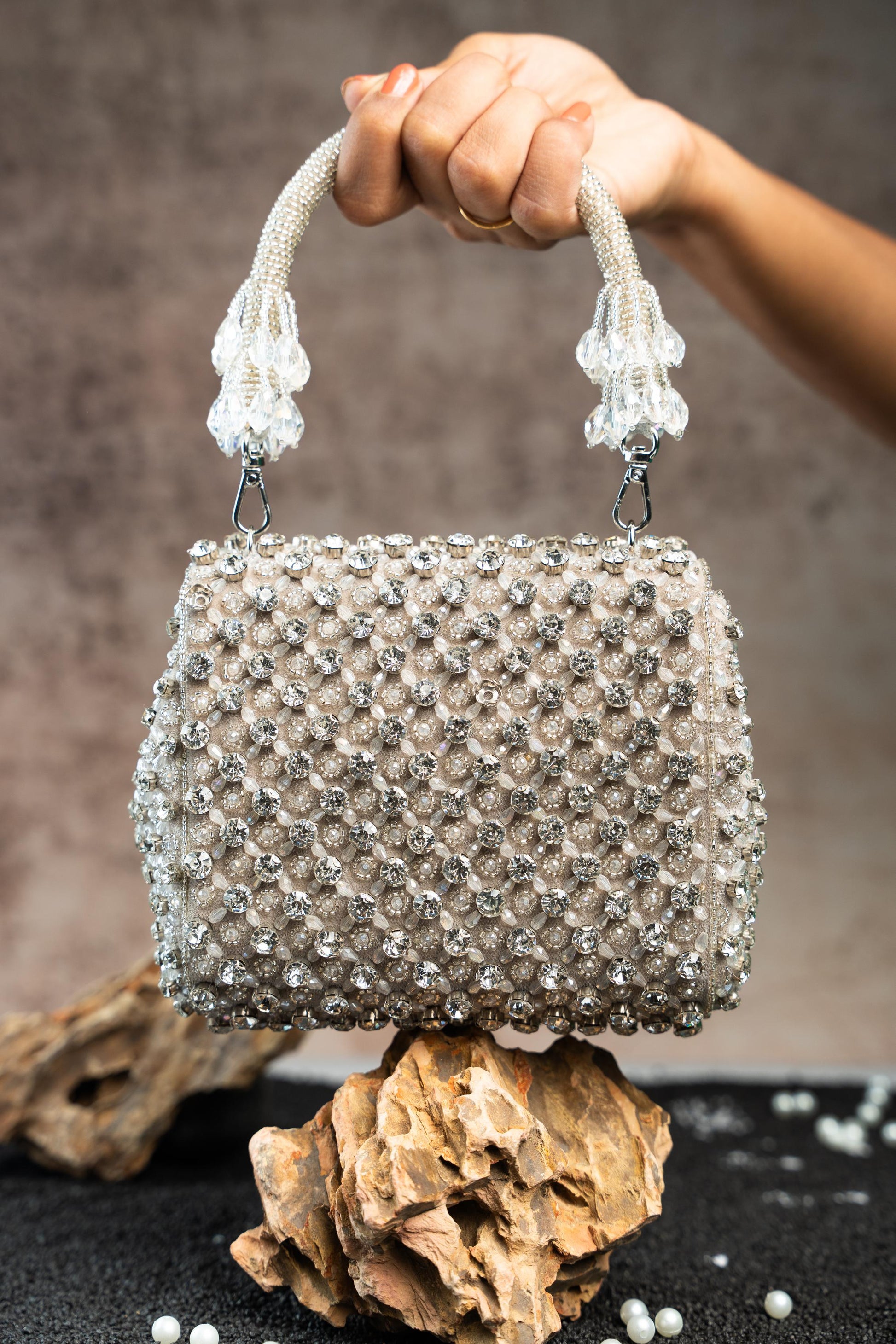 A Silver Mini Bag Adorned With Shimmering Crystals And Intricate Bead Work. Perfect For Adding A Touch Of Elegance And Sparkle To Any Special Occasion, This Clutch Blends Traditional Artistry With A Modern, Sophisticated Design. Comes With A Dazzling Beaded Handle Finish Making It A Convenient And Fashionable Addition.