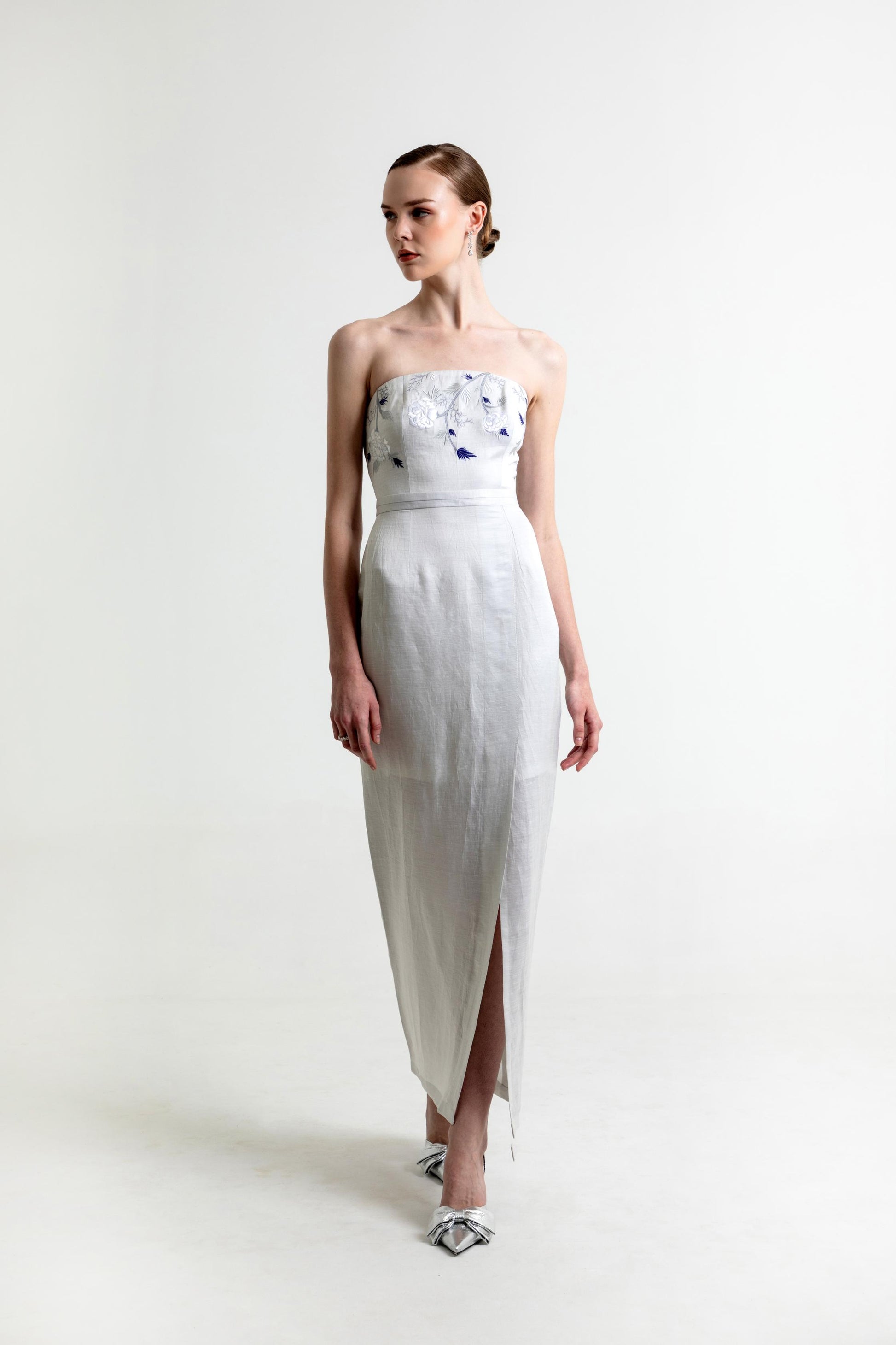 Ethereal And Impossibly Refined, The Avaia Strapless Column Gown Is A Study In Modern Romanticism. Cut In A Statuesque Silhouette That Gently Skims The Body, The Design Balances Simplicity With Intricate Detail. The Clean Neckline Frames The Décolletage With Graceful Ease, Allowing The Spotlight To Fall On The Exquisite Floral Embroidery That Climbs Delicately Across The Bodice.